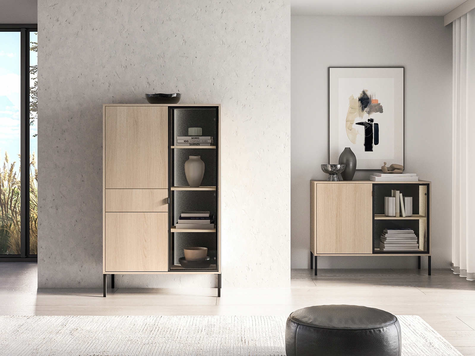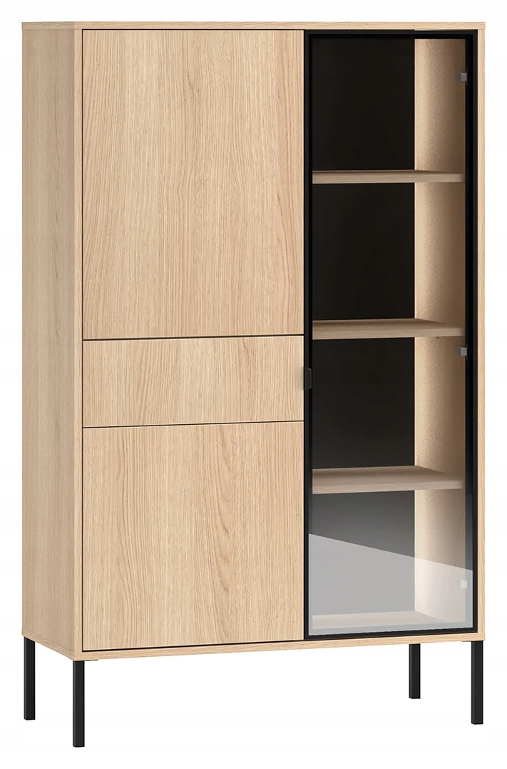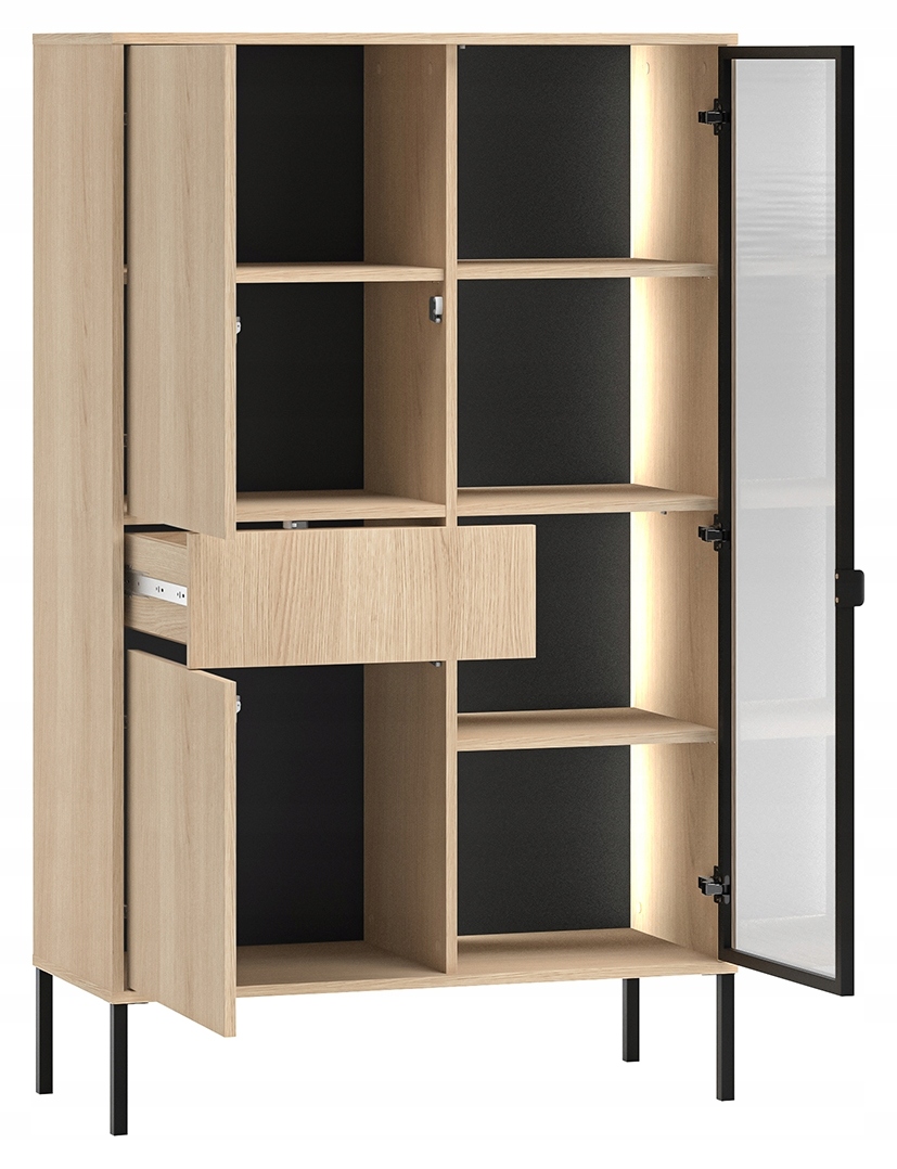 Mebel, którego nowoczesnym design oraz funkcjonalność sprawdzi się w każdym współczesnym wnętrzu. Lewa strona mebla składa się z trzech pojemnych, zamykanych wnęk, w których przechowasz odzież lub domowe tekstylia oraz szuflady, idealnej na dokumenty. Przestrzeń po prawej stronie podzielona jest trzema szklanymi pólkami, tworzącymi cztery wnęki. Dzięki drzwiom z hartowanego szkła wyeksponujesz ulubione przedmioty: stylową zastawę lub pamiątki z podróży. Oświetlenie za szybą dodatkowo podkreśli ich charakter oraz dyskretnie doświetli Twoje wnętrze dodając mu wyjątkowego uroku.