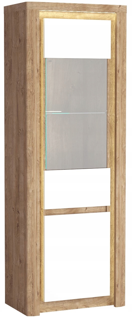 Doskonałe połączenie korpusu w kolorze dąb ribbeck, białych frontów w połysku i przeszklenia. Taka witryna będzie cudownym wykończeniem naszego wnętrza. Dodatkowe oświetlenie LED szklanych półek wyeksponuje porcelanową zastawę, kryształy, czy eleganckie filiżanki. Witryna może również zostać wykorzystana jako biblioteczka, w której zamkniemy cenne dla nas książki. Jest uniwersalna, drzwi witryny mogą zostać przykręcone tak, żeby otwierały się na prawo lub na lewo.