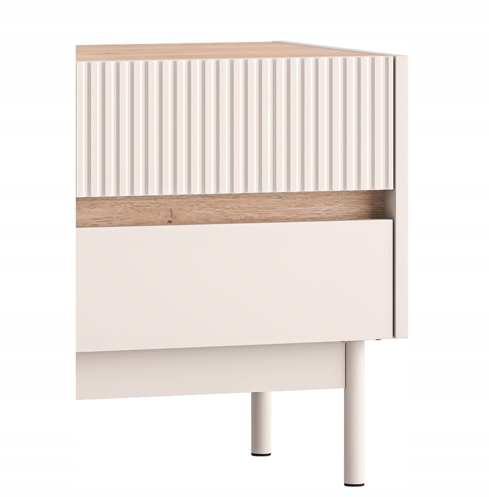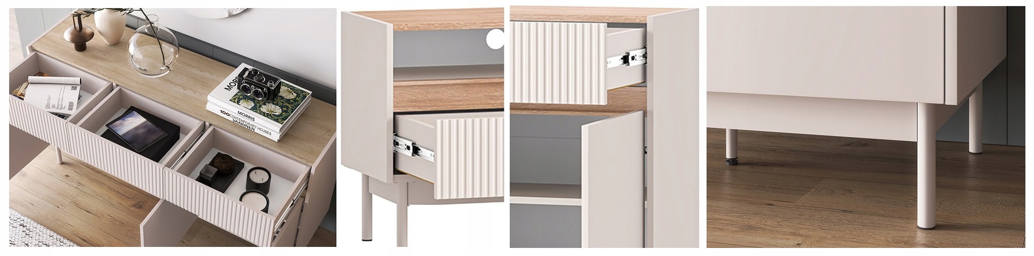 - Wykończenie: Fronty posiadają eleganckie ryflowania, a całość osadzona jest na wysokich, czarnych metalowych nóżkach, co ułatwia sprzątanie pod meblem (np. przez roboty sprzątające).