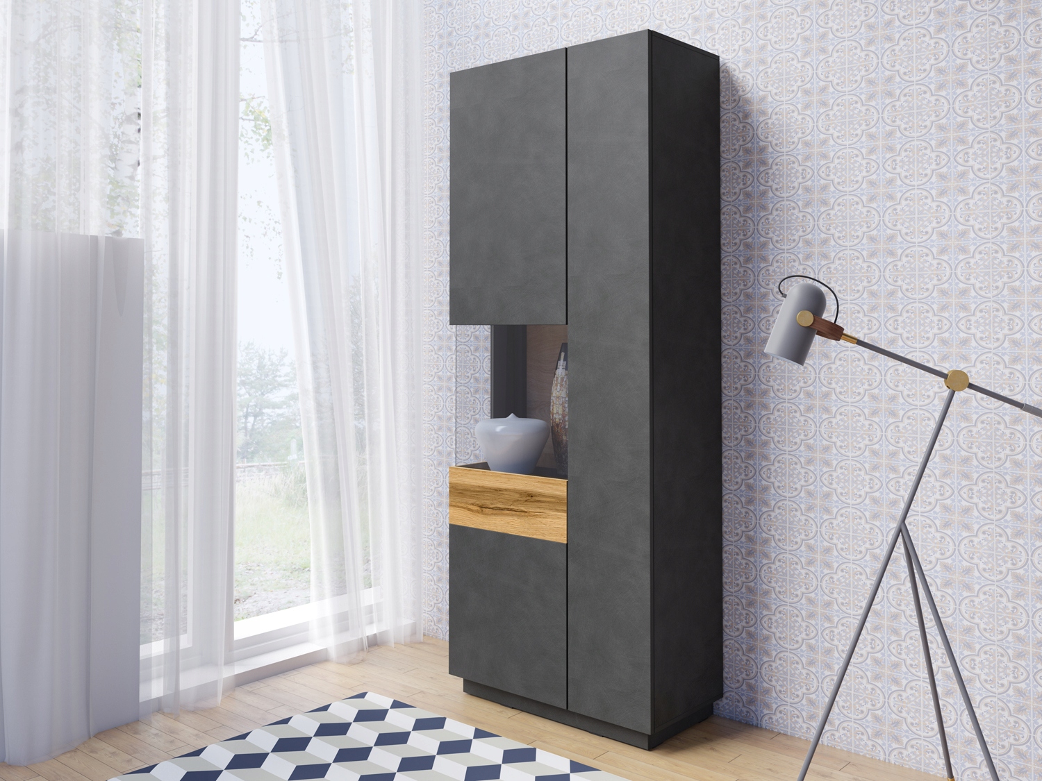 SILKE 12 witryna wysoka, dwudrzwiowa, lewa. Elegancki, prosty design sprawdzi się w nowoczesnych aranżacjach. Wykonana z wysokiej jakości płyty meblowej w kolorze matera – dąb wotan. Oświetlenie LED za dopłatą .