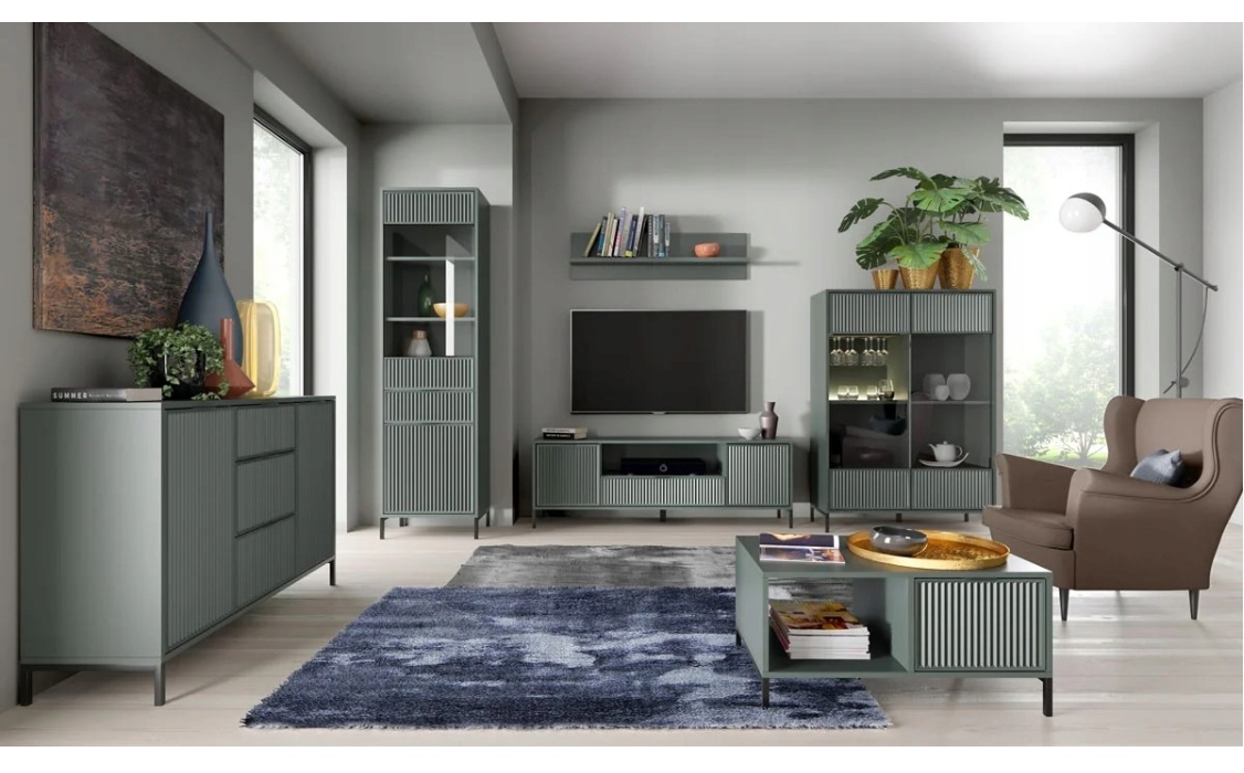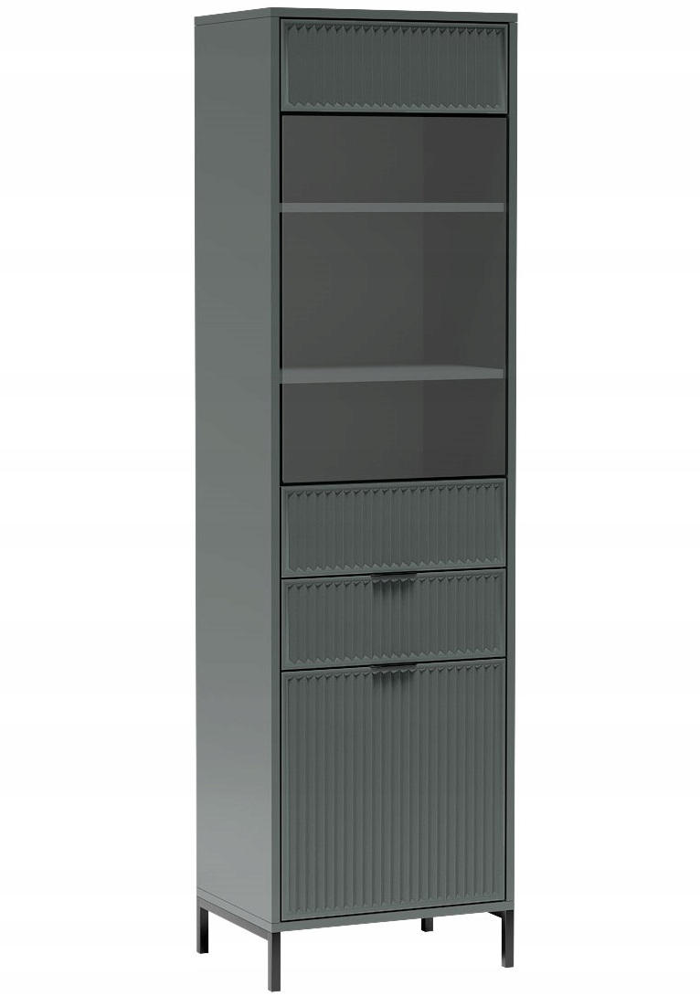 Piękna witryna, która ozdobi każdy salon swoim designerskim wykończeniem. W dolnej części znajdziemy szafkę z półką a nad nią pojemną szufladę. Górna część to szklana witryna z dwoma półkami. Witryna została wyposażona w system push to open. Dostępna w trzech kolorach – cashmere/indigo/green stone.