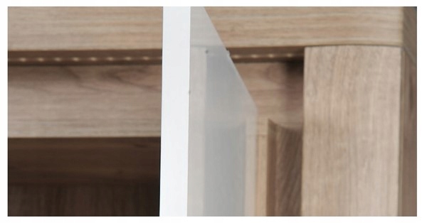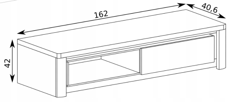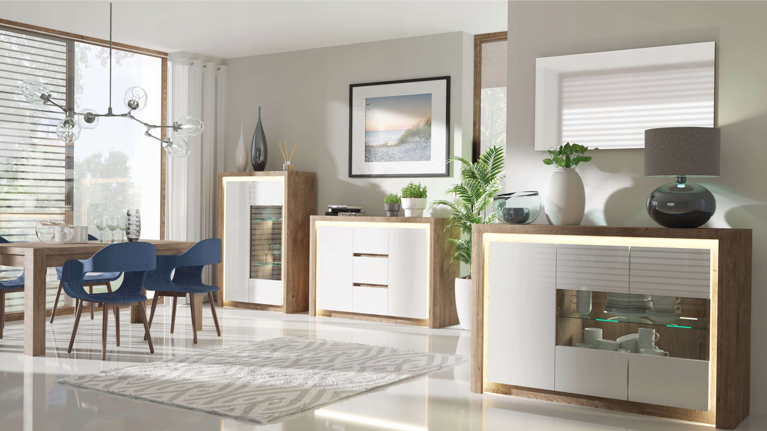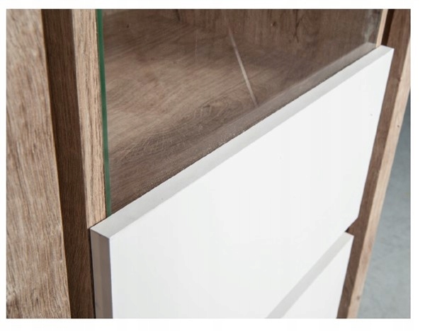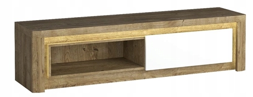 Zastosowane naturalne wybarwienie korpusu i frontów wpasuje się w każde wnętrze. Szafka posiada z prawej strony zamykaną szafkę z frontem w formie klapy, otwieraną do dołu. Lewa strona to otwarta półka na której można postawić dekoder czy sprzęt muzyczny. Ważne by czuć się w miejscu relaksu swobodnie. Umili nam czas oświetlenie zastosowane w meblu, możemy z niego skorzystać o zmroku. Szafka doskonale będzie się prezentować z innymi elementami z systemu, tworząc wspólną całość w pięknych kolorach.