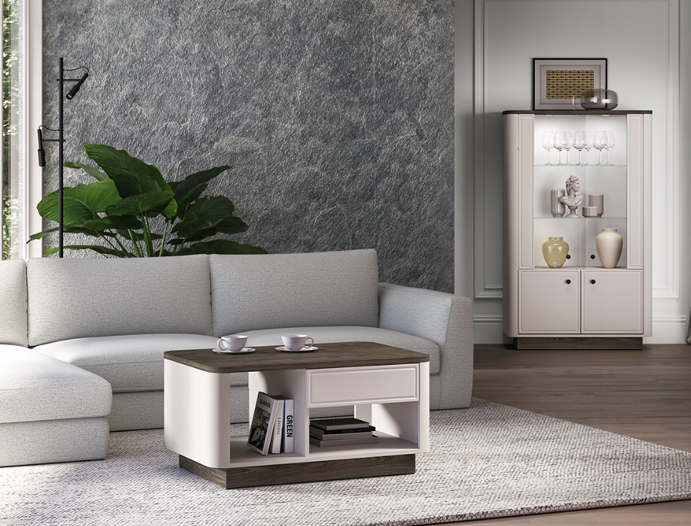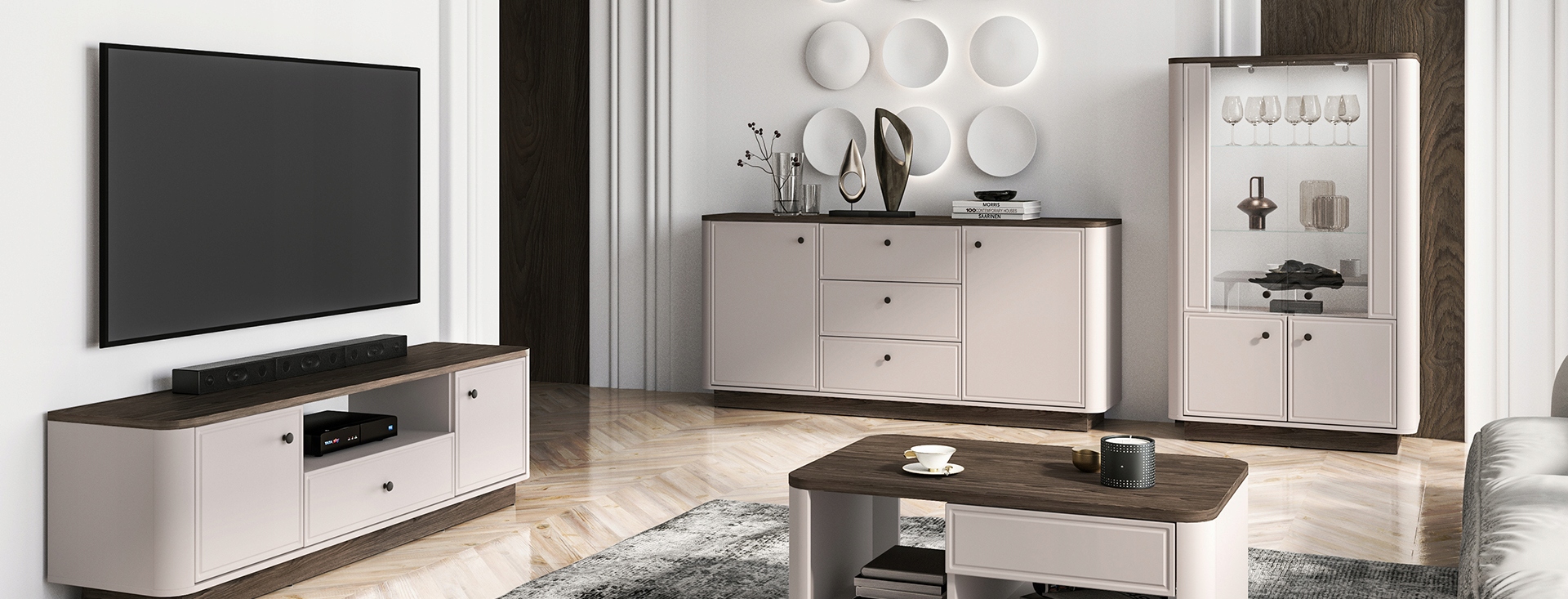 Meble Vilavio to wyjątkowo elegancka kolekcja do salonu czy sypialni. Bryły przyciągają uwagę pięknie zaoblonym przejściem między korpusem a frontami. Kontrastowe zestawienie dekorów – klasyczny kaszmirowy oraz ciemno barwiony dąb Windmill – podkreśla charakter mebli Vilavio. Drzwiczki oraz szuflady wykonane z płyty MDF z ozdobnym frezowaniem wskazują na wyrafinowany styl całej kolekcji. Gustowne, metalowe uchwyty dodają całości szyku i wysmakowania. Meble Vilavio wypełnią Twoje wnętrze wytwornością i finezyjną estetyką.