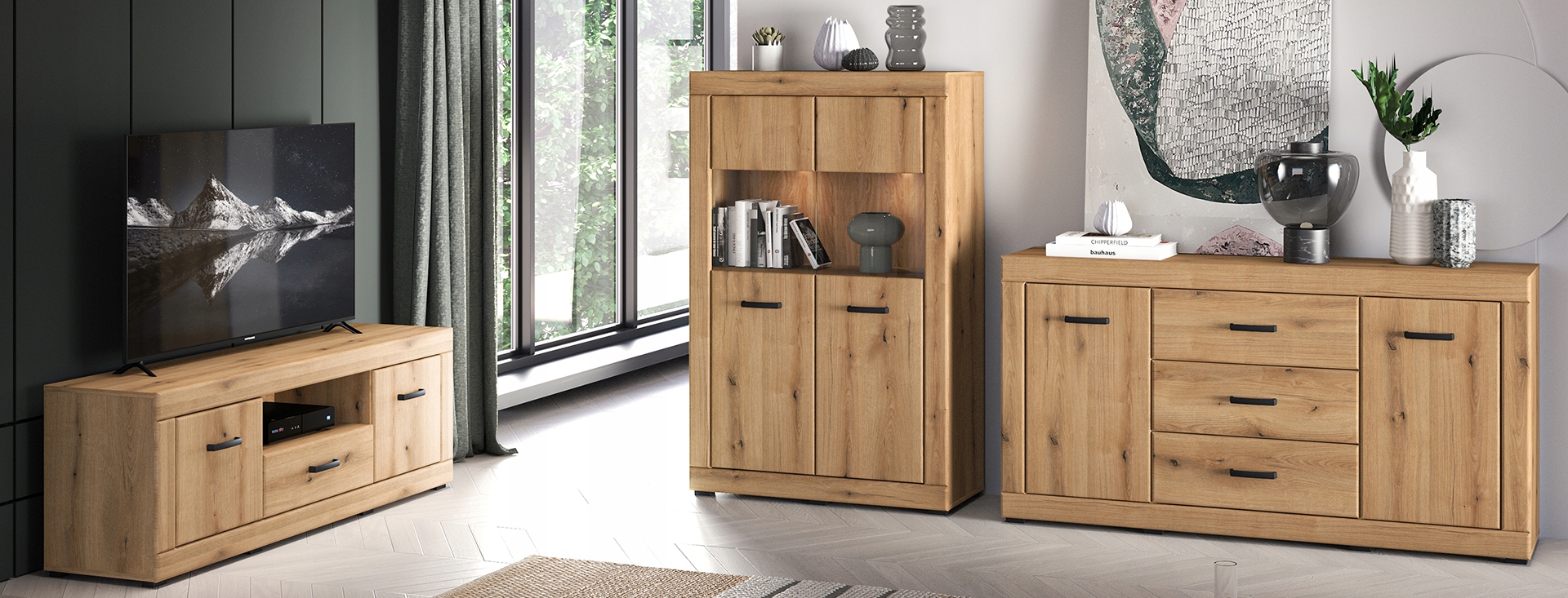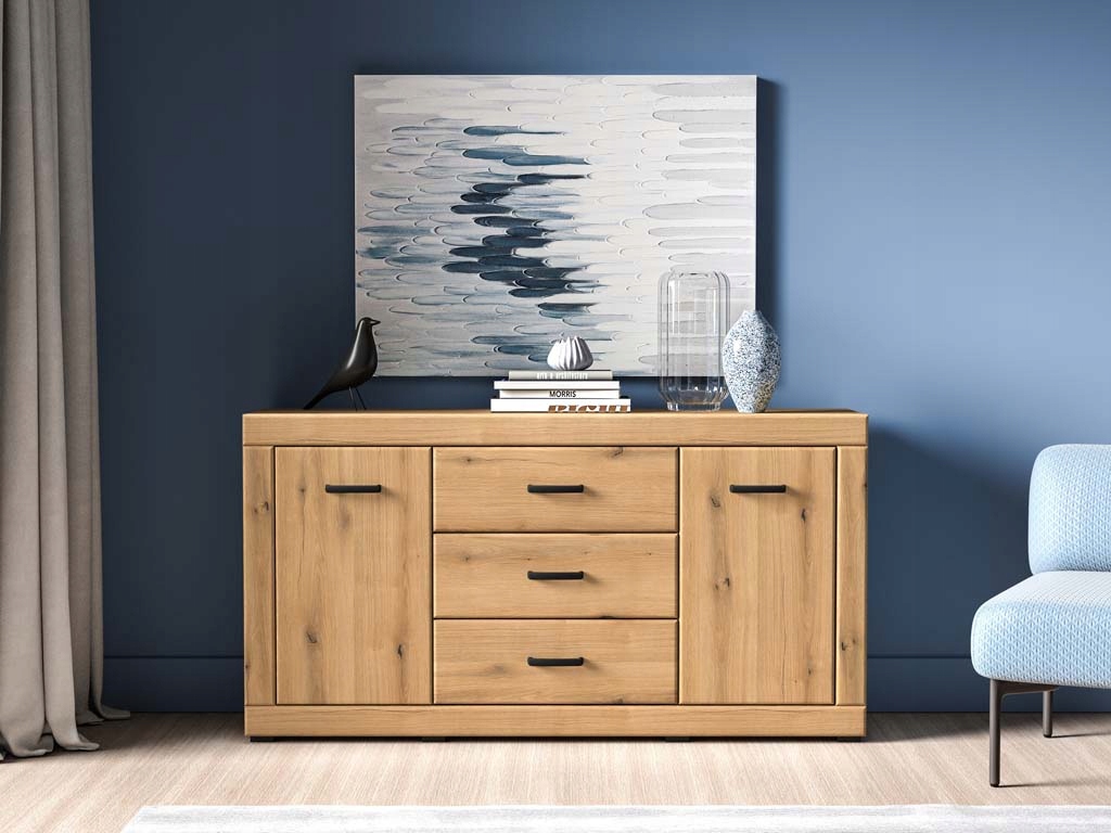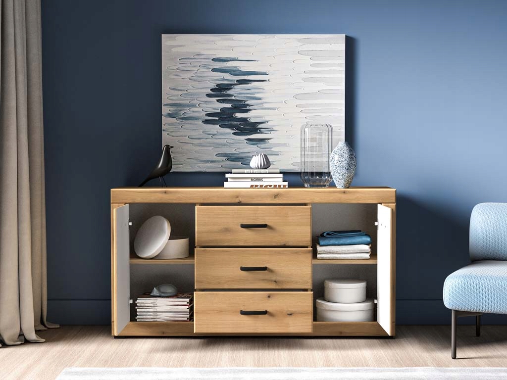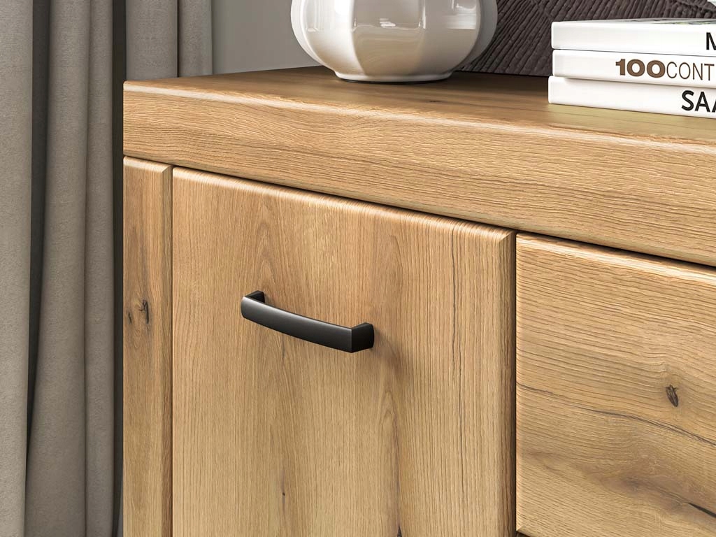 Duża komoda Dora 04 to idealny mebel do przechowywania. Za obojgiem drzwiczek kryją się łącznie cztery pojemne wnęki. Przechowasz w nich ubrania, ręczniki czy zastawę stołową. Środkową część mebla tworzą trzy szuflady, idealne na dokumenty lub domowe tekstylia. Szeroki blat będzie idealnym miejscem do wyeksponowania eleganckich wazonów lub pamiątek z podróży. Wybierz komodę Dora i zachowaj porządek w swoim wnętrzu.
