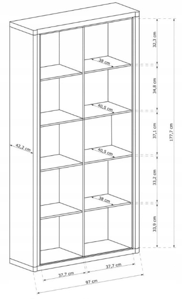 Posiada cztery półki, dwie szuflady oraz dwie szafki.