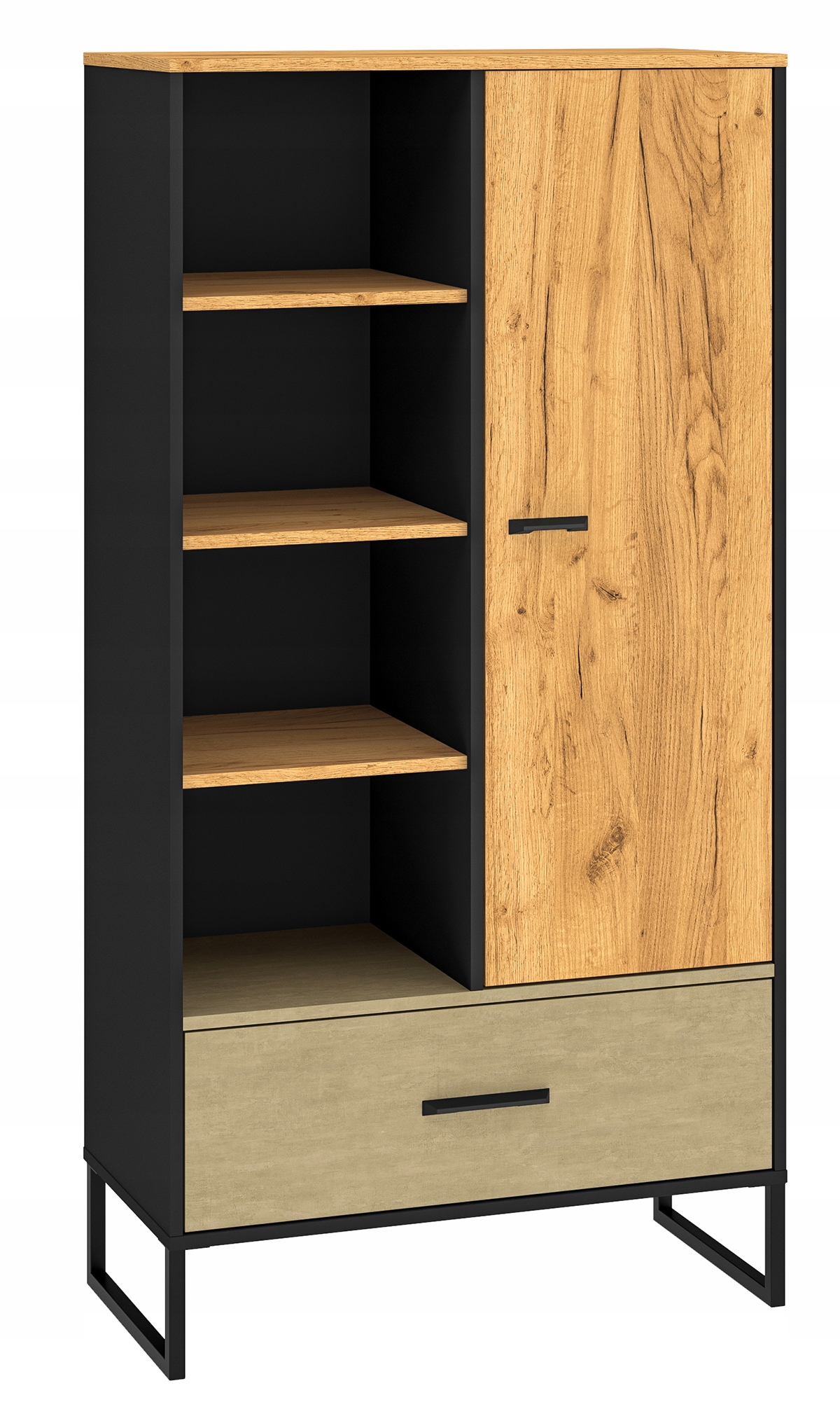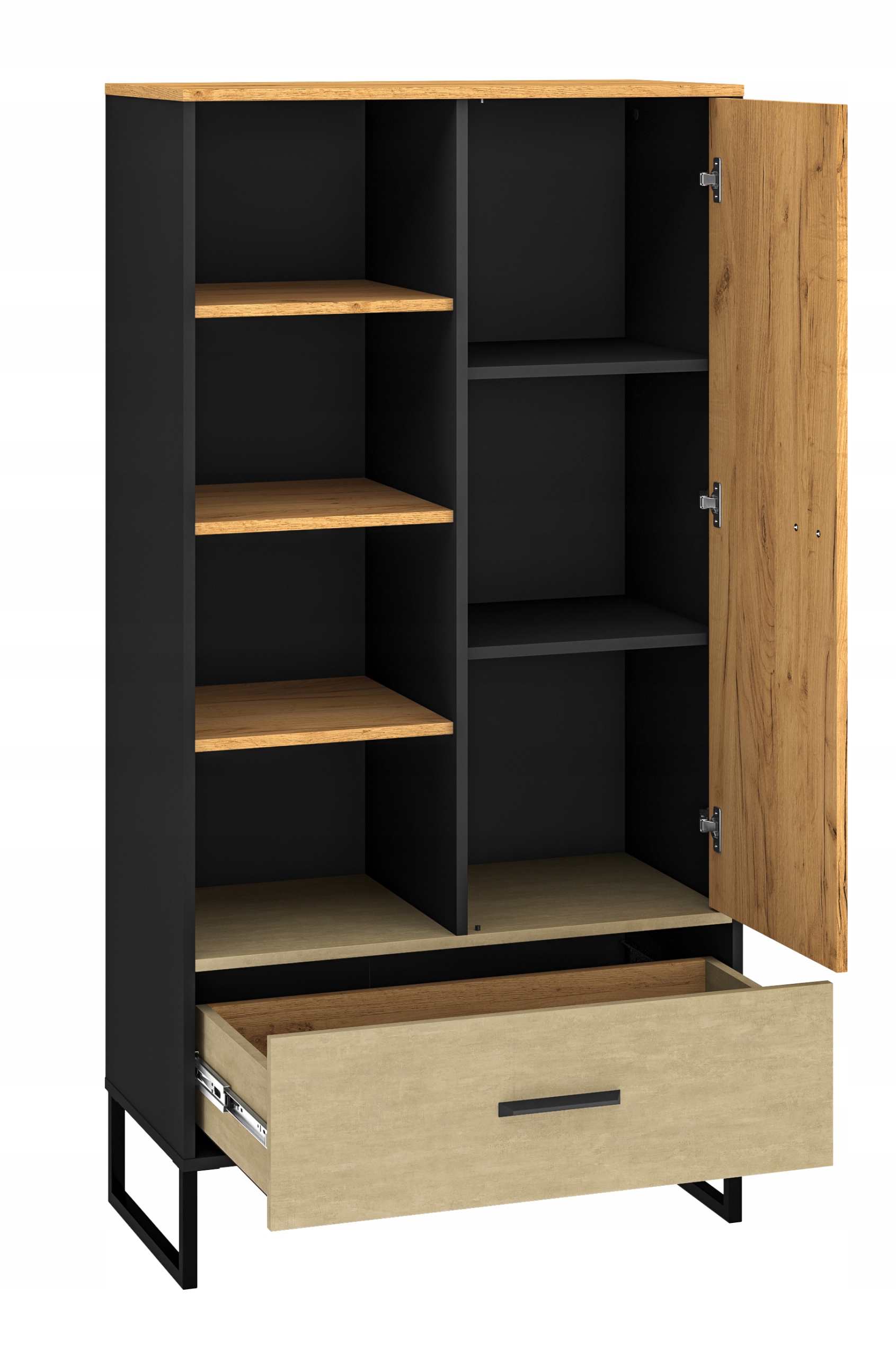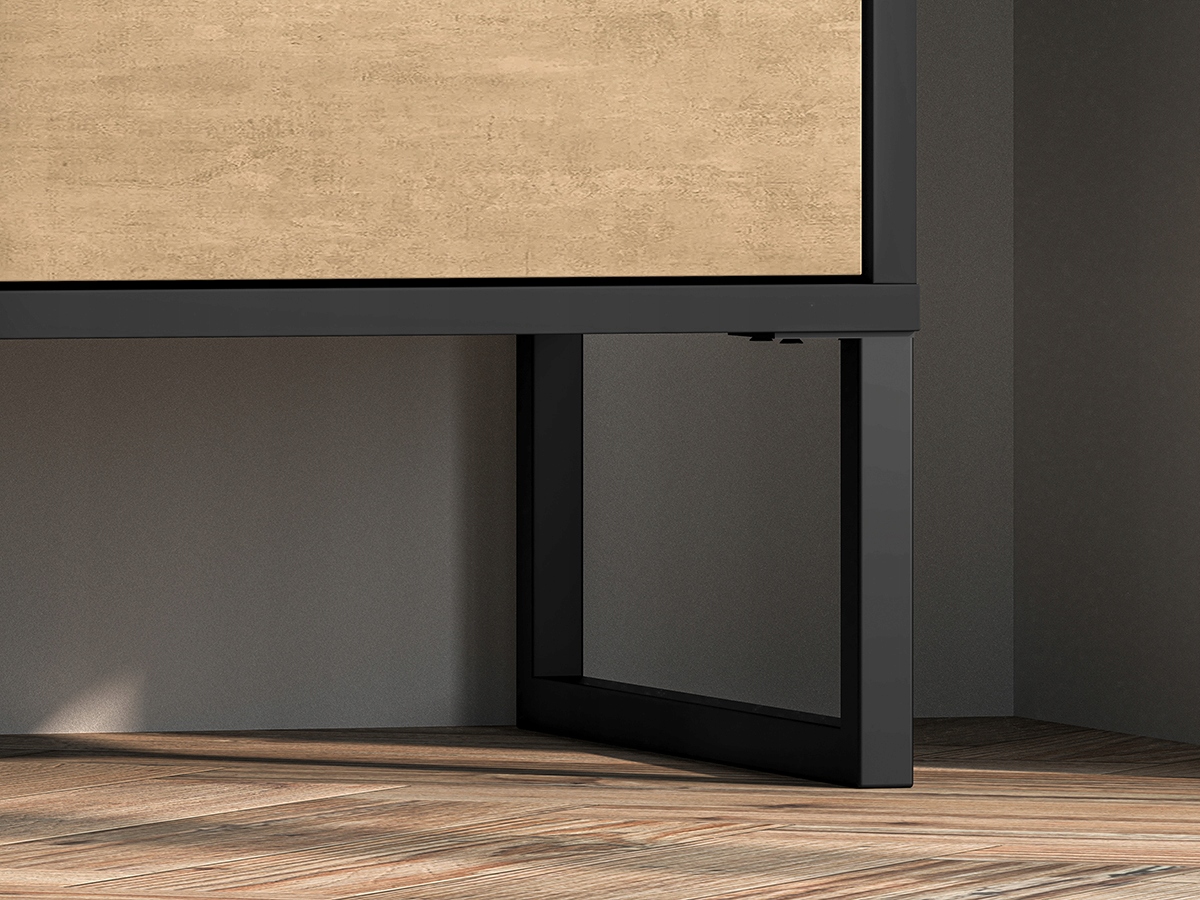 - Loftowy charakter: Połączenie ciepłego odcienia Dąb Craft Złoty z surową Czernią oraz metalicznymi wstawkami Stal Premium sprawia, że mebel prezentuje się niezwykle prestiżowo.