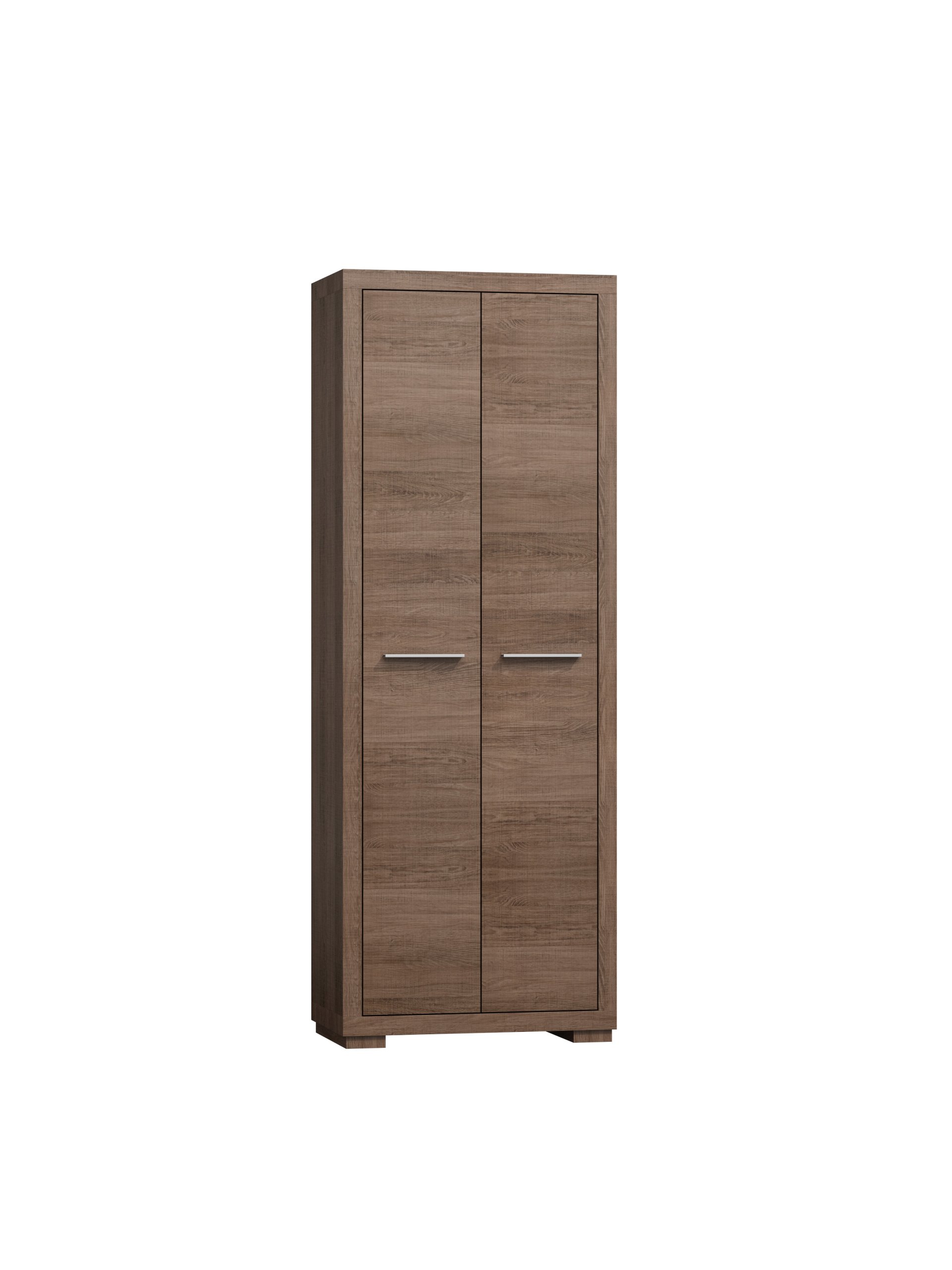 Prosta szafa dwudrzwiowa do przechowywania ubrań. Posiada cztery półki w środku, co pozwala na wykorzystanie przestrzeni szafy w 100%. Organizacja z tym meblem to sama przyjemność. Pasuje do salonu, sypialni czy biura lub gabinetu. Można stworzyć z nią wiele aranżacji, wprowadzając do pomieszczenia ciepła oraz miłego klimatu. Metalowe uchwyty uwydatniają potencjał mebla. Dostępna w dwóch wybarwieniach.