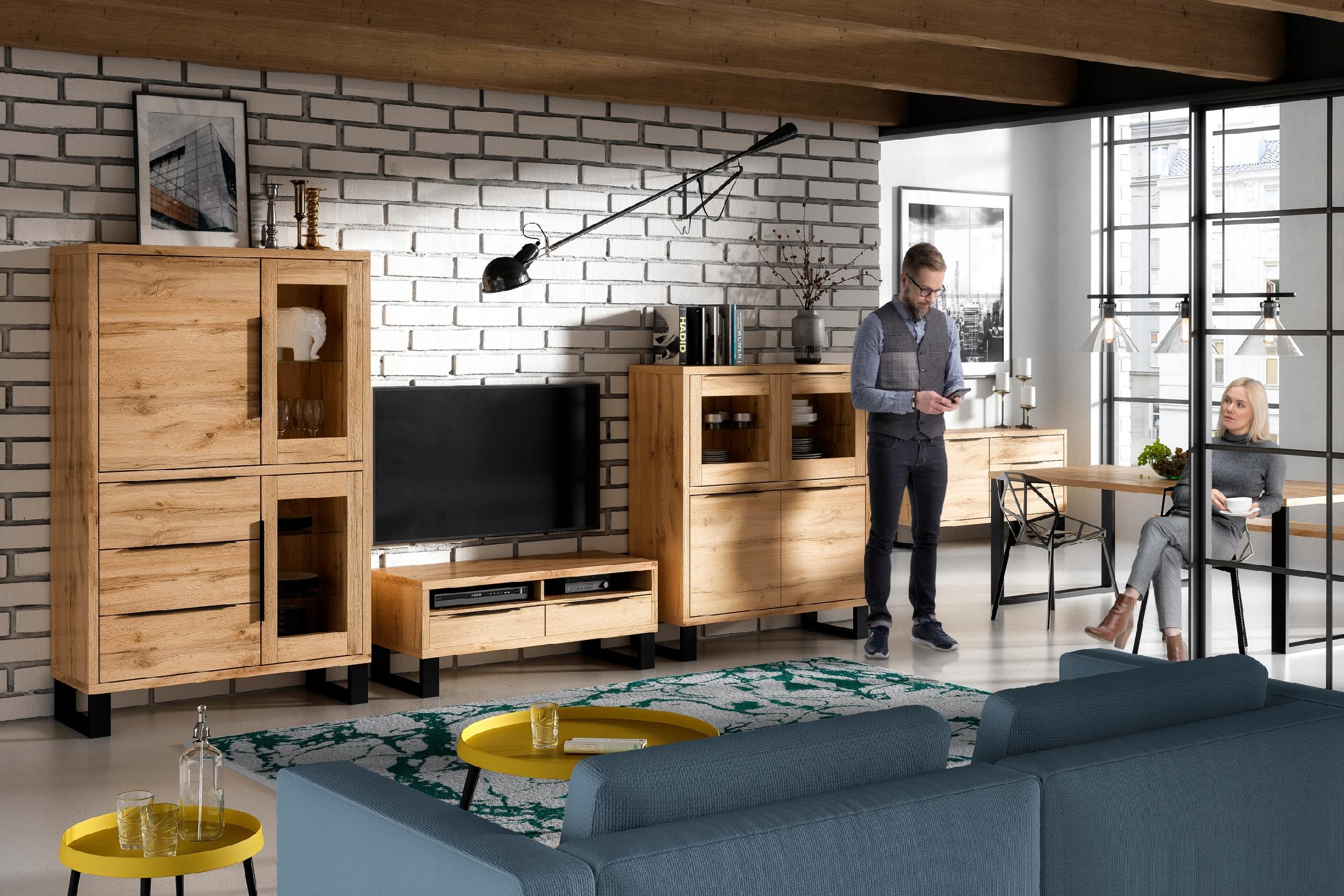 Dla fanów współczesnych loftów i wnętrz z industrialnym polotem proponujemy kolekcję HALLE, inspirowaną pofabryczną przestrzenią o surowym charakterze. To harmonizujący duet wybarwienia naturalnego drewna z chłodnym metalowym wykończeniem. Kolekcja występuje w naturalnym kolorze dębu wotan o wyraźnym usłojeniu. Pozornie masywna konstrukcja została wsparta na ciemnych, metalowych nogach. Kolekcja HALLE nie tylko inspiruje, ale dostarcza również gotowych rozwiązań do pokoju dziennego i jadalni.