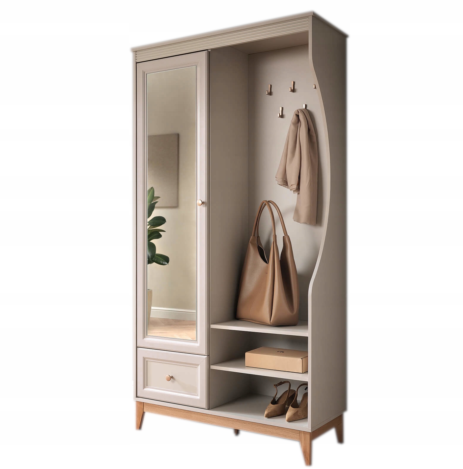 Odkryj elegancką garderobę Windsor w kolorze kaszmir od JARSTOL. Nowoczesna szafa z lustrem, wieszakami i półkami. Idealna do sypialni i przedpokoju.
