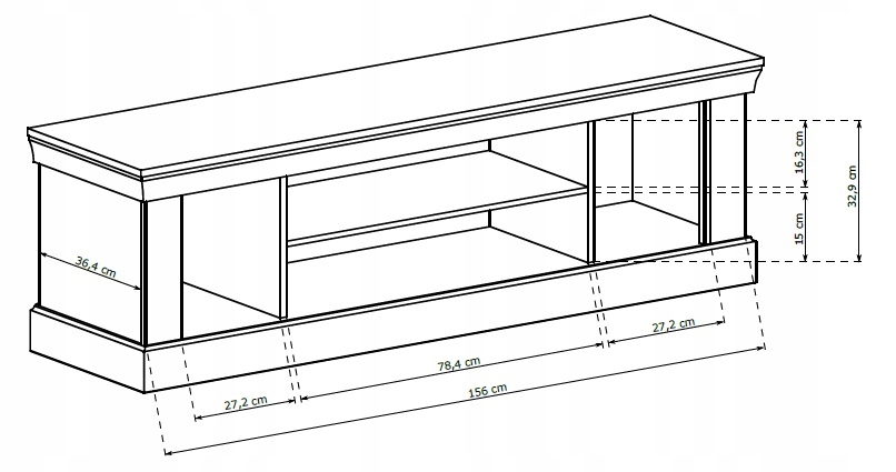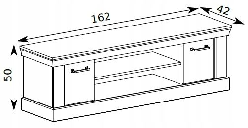 Posiada dwie szafki po bokach z pustą przestrzenią do wykorzystania w środku oraz półkę na środku perfekcyjną na dekoder, do eksponowania pamiątek bądź porcelany.