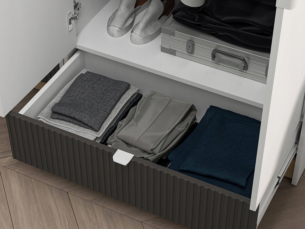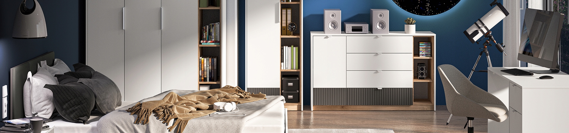 Meble z kolekcji Torino to połączenie współczesnego designu i funkcjonalności. Nowoczesne bryły z oryginalnymi ryflowanymi wstawkami MDF wprowadzą do wnętrza niepowtarzalny charakter. Modne zestawienie kontrastujących dekorów – tradycyjna biel, ciepły dąb Castello, ciemny, matowy grafit – podkreśli indywidualny styl i dynamikę młodych ludzi. Dzięki szerokiej gamie brył wszystkie przedmioty znajdą swoje miejsce, a Twoje wnętrze pozostanie uporządkowane. Dostęp do środka brył zapewniają wygodne, minimalistyczne w formie i barwie uchwyty. Kolekcja stworzona jest z myślą o dużych jak i małych wnętrzach.