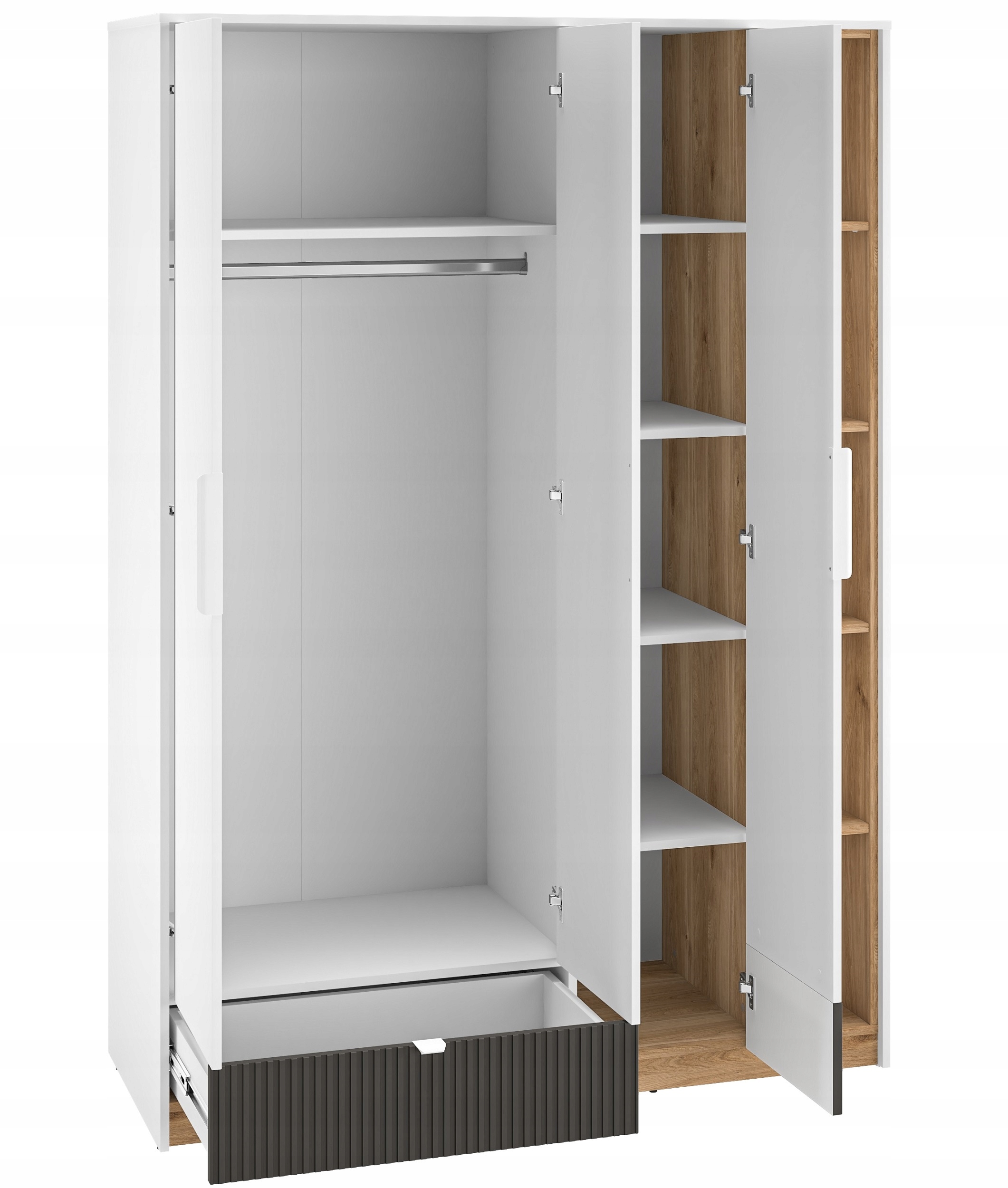 Szafa biała trzydrzwiowa z regałem szuflada półki drążek Torino 01 138cm