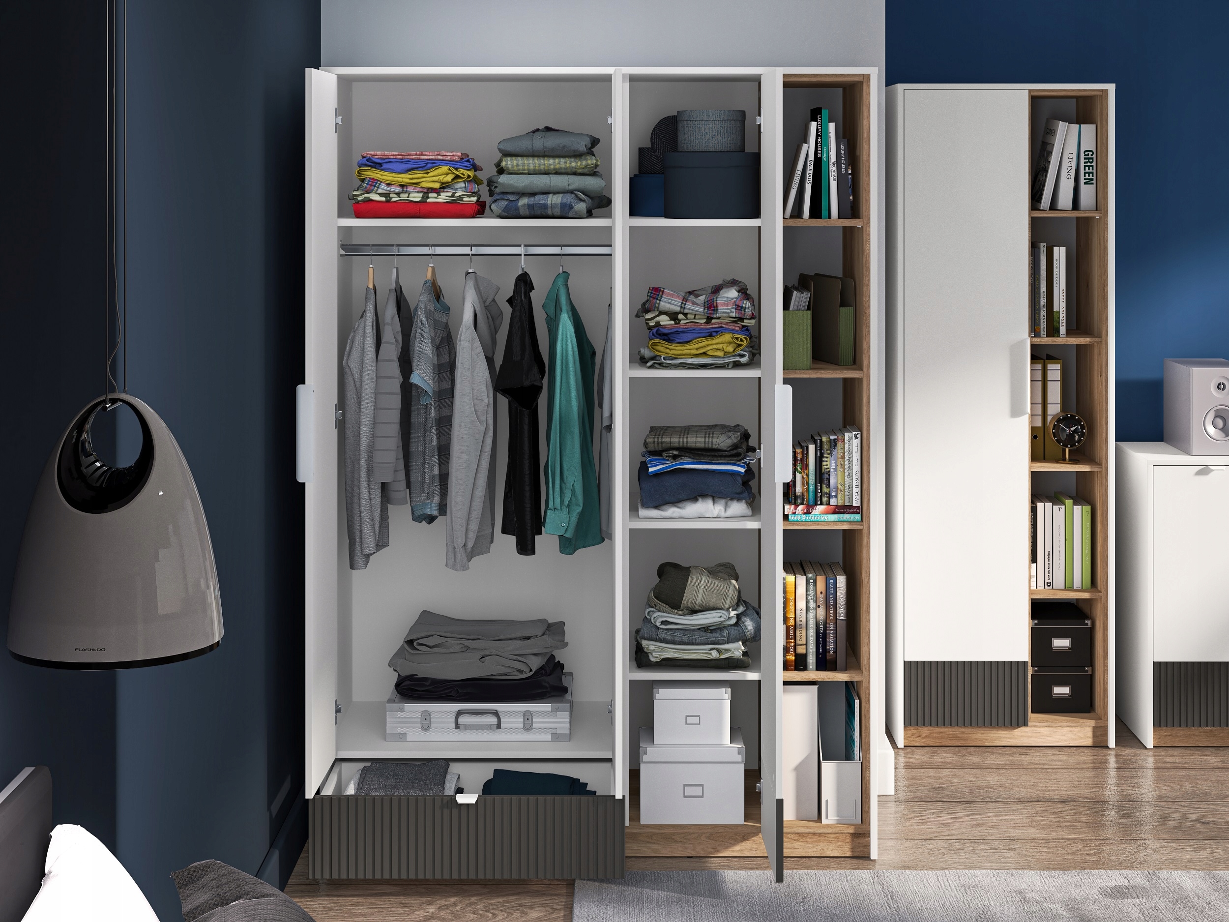Meble z kolekcji Torino to połączenie współczesnego designu i funkcjonalności. Nowoczesne bryły z oryginalnymi ryflowanymi wstawkami MDF wprowadzą do wnętrza niepowtarzalny charakter. Modne zestawienie kontrastujących dekorów – tradycyjna biel, ciepły dąb Castello, ciemny, matowy grafit – podkreśli indywidualny styl i dynamikę młodych ludzi. Dzięki szerokiej gamie brył wszystkie przedmioty znajdą swoje miejsce, a Twoje wnętrze pozostanie uporządkowane. Dostęp do środka brył zapewniają wygodne, minimalistyczne w formie i barwie uchwyty. Kolekcja stworzona jest z myślą o dużych jak i małych wnętrzach. Odpowiednio dobrane materiały i kolory sprawią, że mebel spodoba się zarówno nastolatkom jak i ich rodzicom.