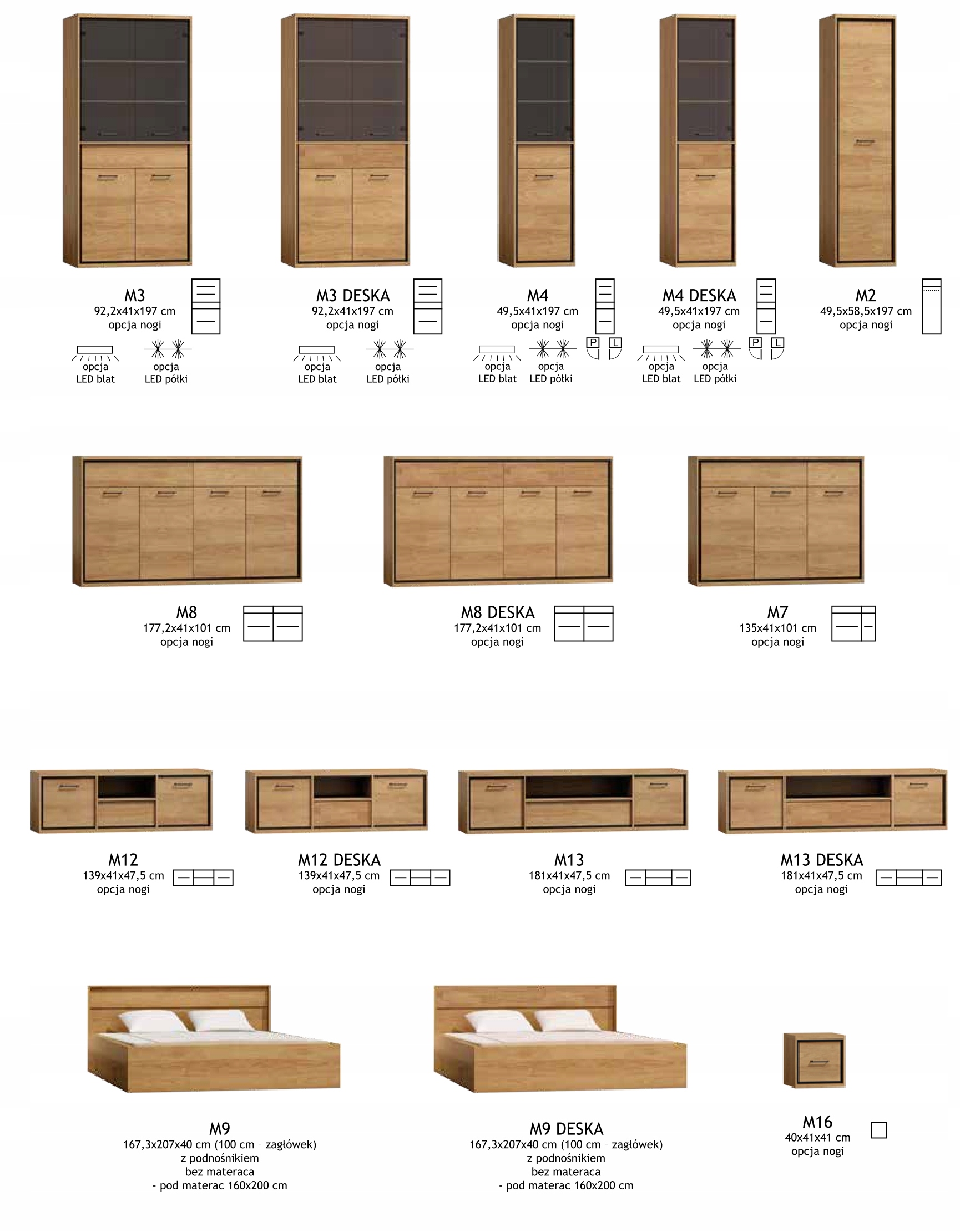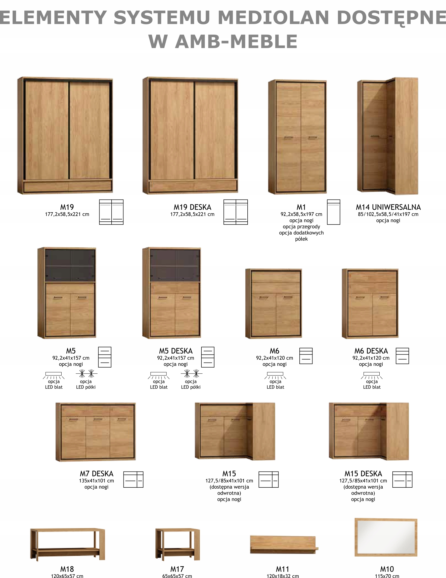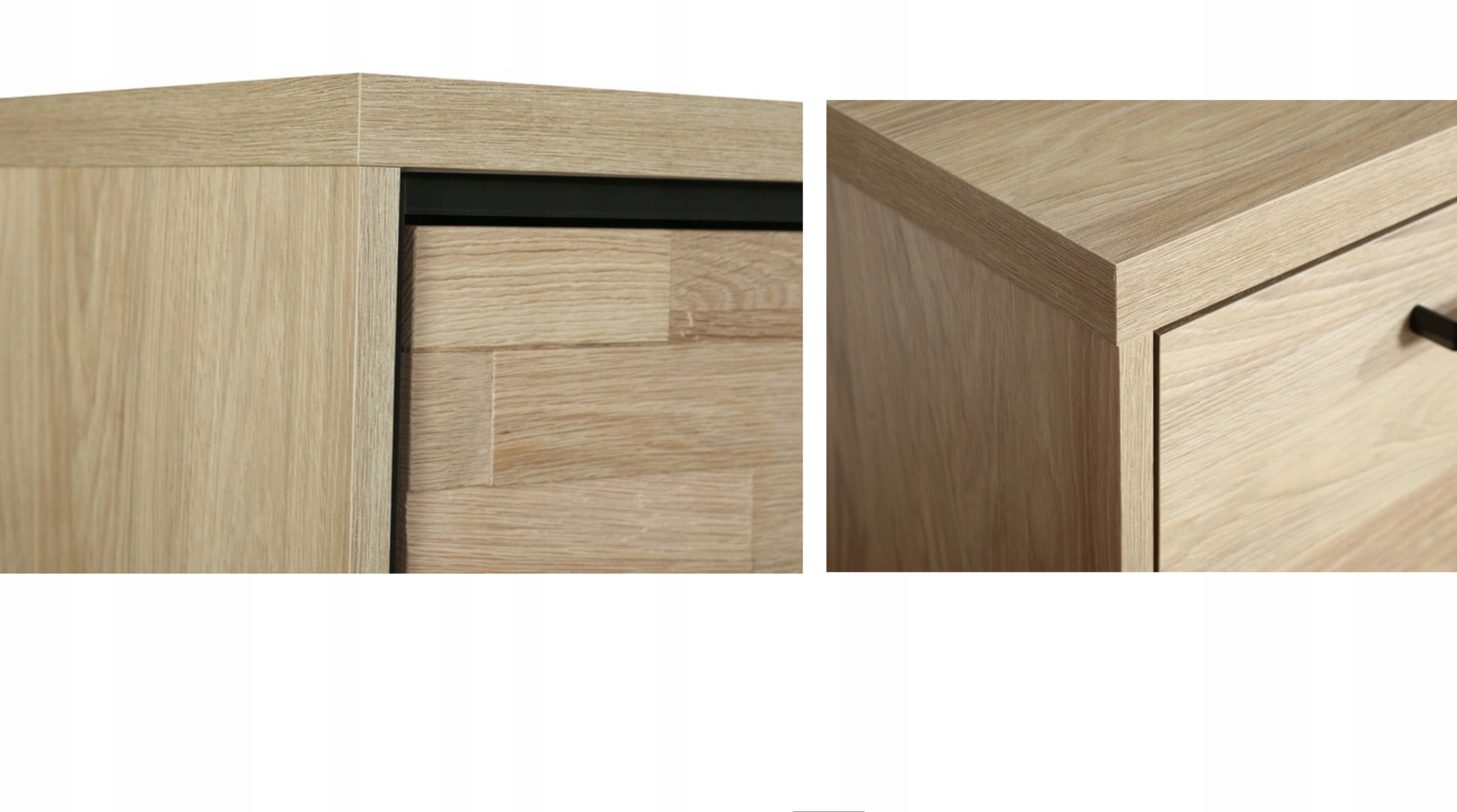 System MEDIOLAN to nowoczesny wygląd połączony z prostotą kształtów. Unikalne fronty szuflad wykonane z naturalnego drewna dębowego z charakterystycznym łupanym wzorem, nadadzą swoistego charakteru sypialni, przedpokoju, czy pokoju dziennego a czarna ramka MDF w połączeniu z jasnym i ciepłym kolorem mebli, dodatkowo wzmocni efekt wizualny. Zastosowany w szufladach system PUSH TO OPEN, zawiasy typu „cichy domyk” oraz stylowe, metalowe uchwyty, to połączenie doskonałych walorów estetycznych z wygodą użytkowania. Zaletą systemu MEDIOLAN jest fakt posiadania sporej liczby brył, wchodzącej w jego skład. Sprawia on, że możemy świetnie zaprojektować wnętrze naszego salonu, sypialni a także biura lub gabinetu. Specjalnie dobrana tekstura i kolorystyka oraz połączenie surowości drewna i grubości blatów, podkreśla optycznie solidność budowy mebla. Wysoka dbałość o najmniejsze szczegóły i niepowtarzalne, oryginalne wykończenie sprawią, że system MEDIOLAN zadowoli najbardziej wymagających Klientów.