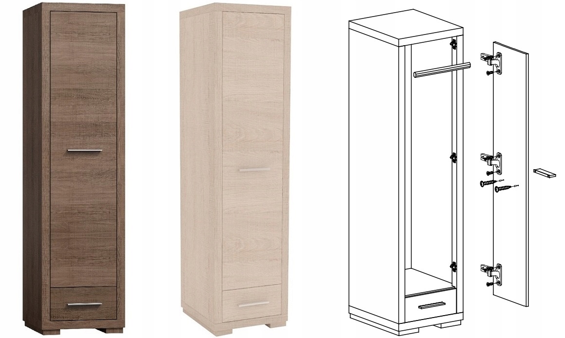 Szafa jednodrzwiowa z kolekcji Vegas. Posiada w środku drążek, który pozwala na zapełnienie wolnej przestrzeni szafy. Poniżej znajduje się mała szuflada na drobniejsze akcesoria. Szafa będzie pasować do wielu aranżacji, wpasuje się w każdy kąt i wprowadzi miłej atmosfery do pomieszczenia. Metalowe uchwyty uwydatniają stanowczość mebla. Dostępna w dwóch wybarwieniach.