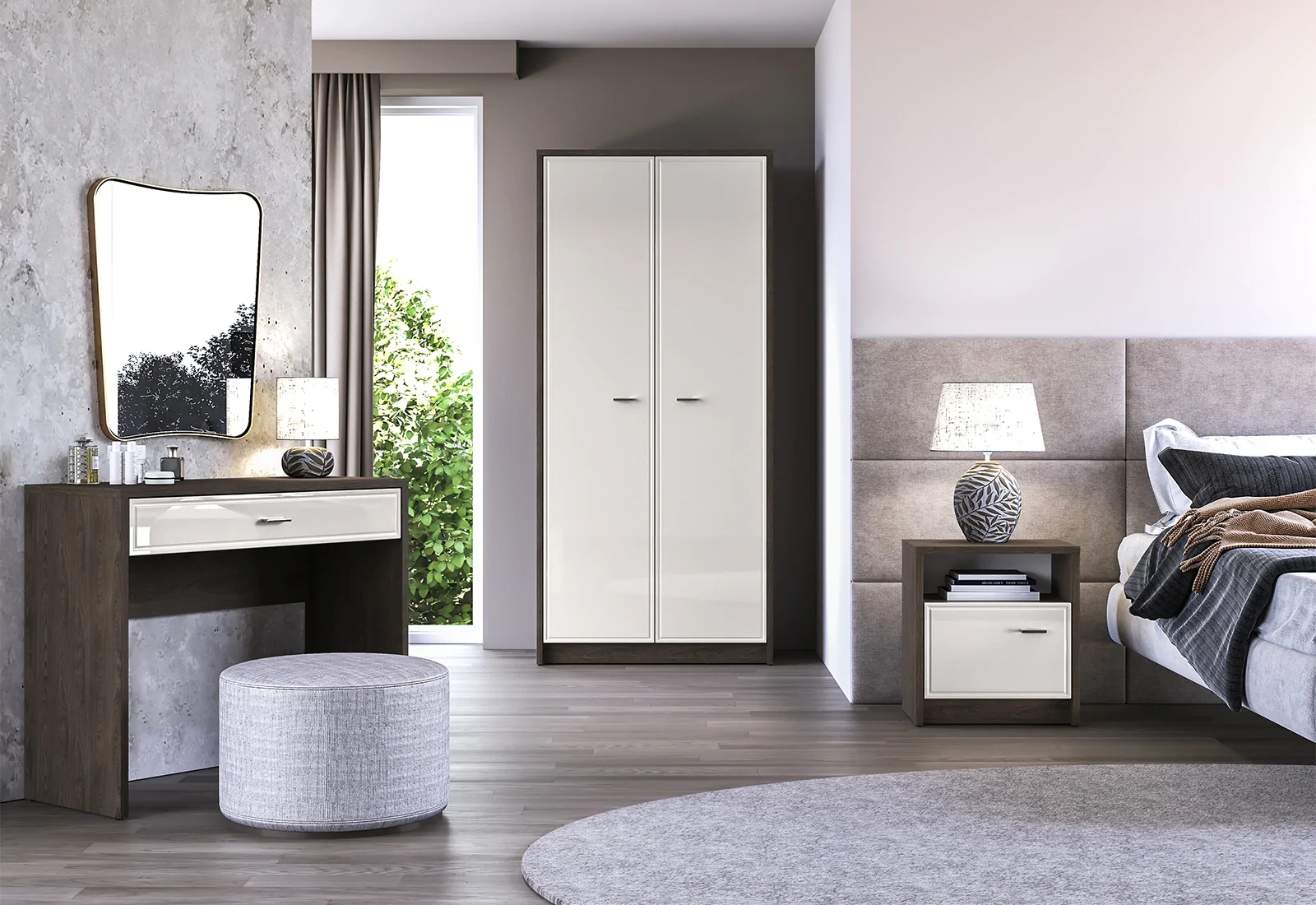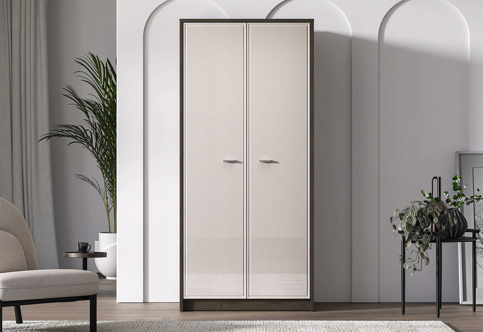 Szafa AVANTE 01 od ML Meble łączy ciemny korpus w dekorze dąb Windmill z jasnymi, kaszmirowymi frontami MDF w połysku. Subtelne frezowanie porządkuje płaszczyzny i dodaje bryle lekkości, a lustrzane, metalowe uchwyty działają jak biżuteria – dyskretnie podkreślają charakter mebla i pięknie odbijają światło. Ten kontrast kolorów i faktur tworzy nowoczesny, a zarazem przytulny efekt, który sprawdzi się zarówno w jasnych, jak i nastrojowych aranżacjach sypialni.
