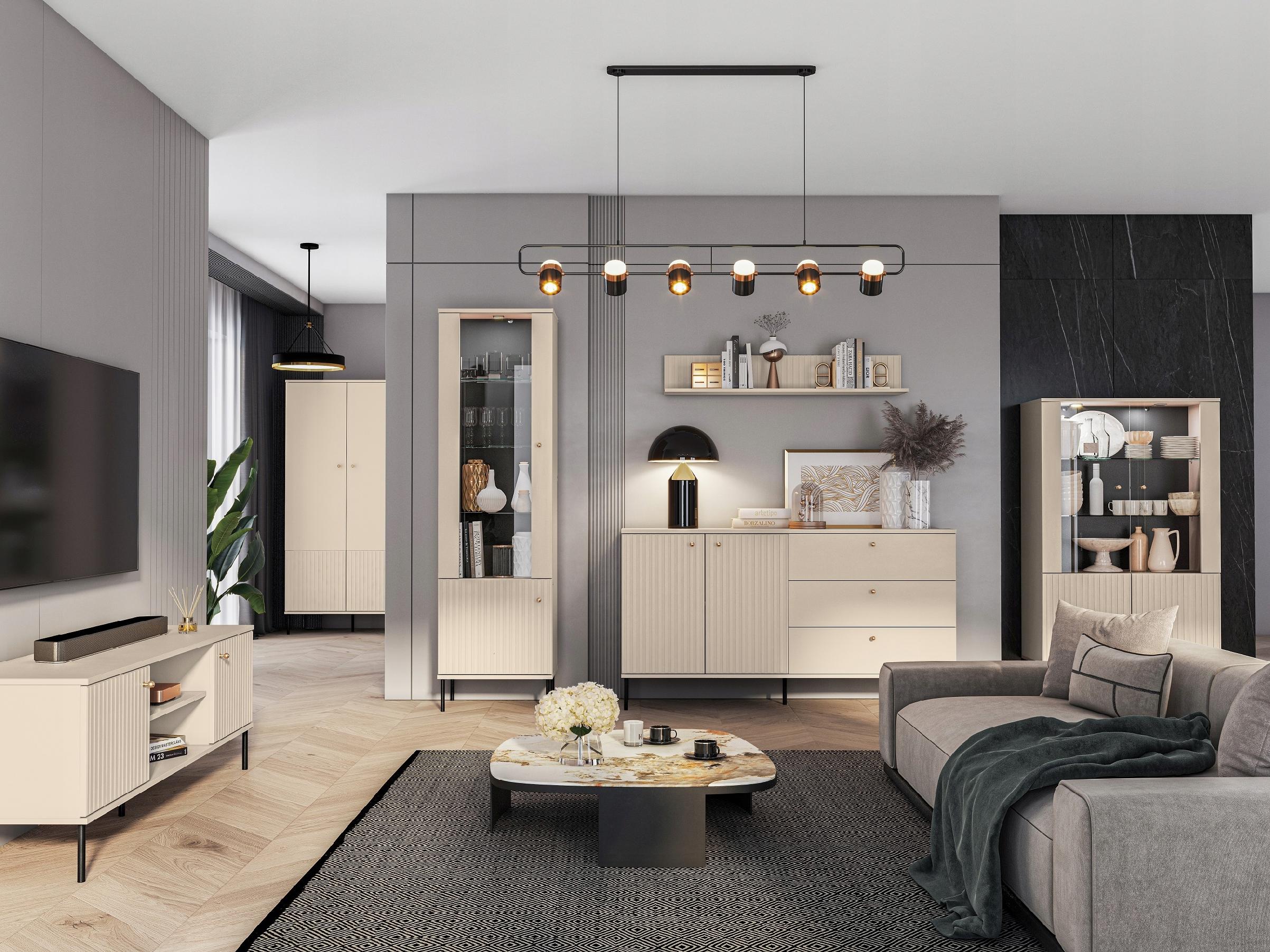 - Ryflowane Fronty: Charakterystyczne pionowe frezowania na drzwiach nadają bryle trójwymiarowości i artystycznego sznytu.