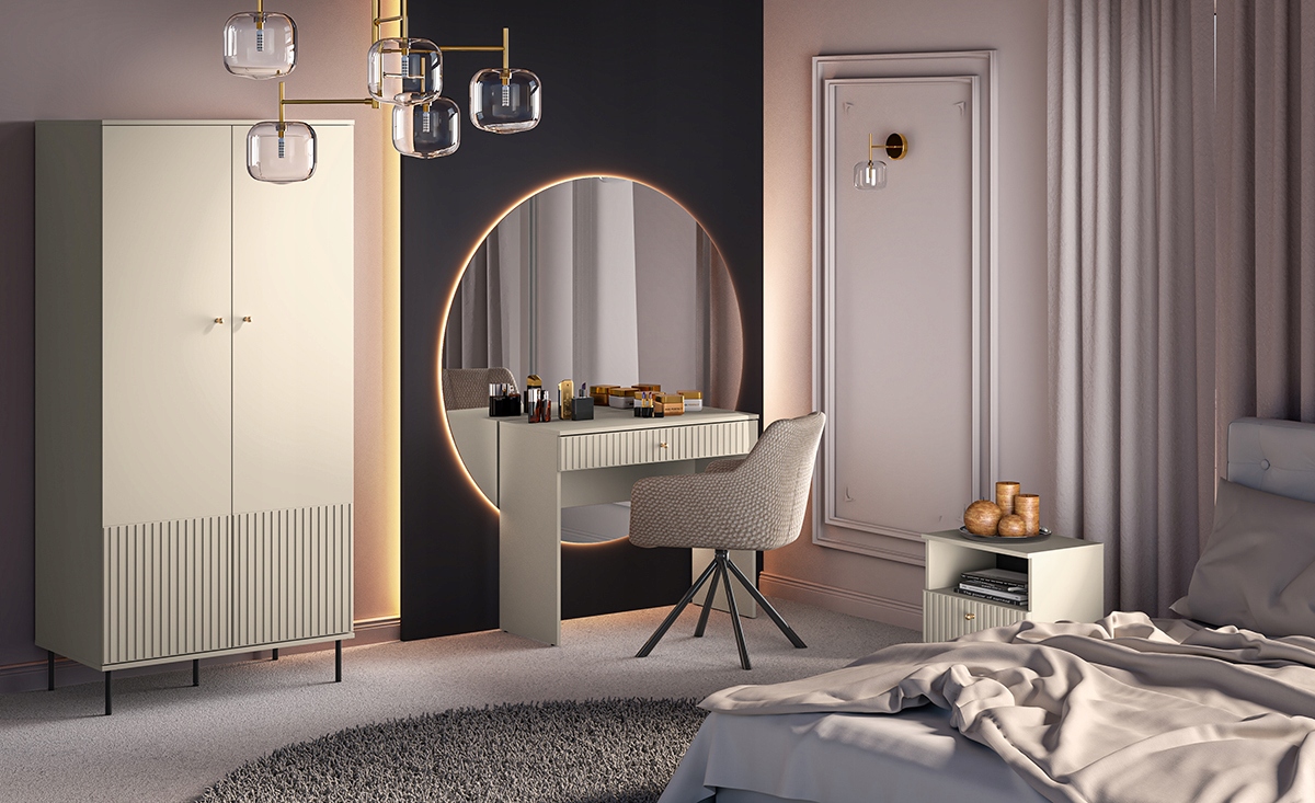 - Kaszmirowa Harmonia: Subtelny odcień kaszmiru ociepla wnętrze i sprawia, że szafa nie przytłacza pomieszczenia, wtapiając się w jego strukturę.