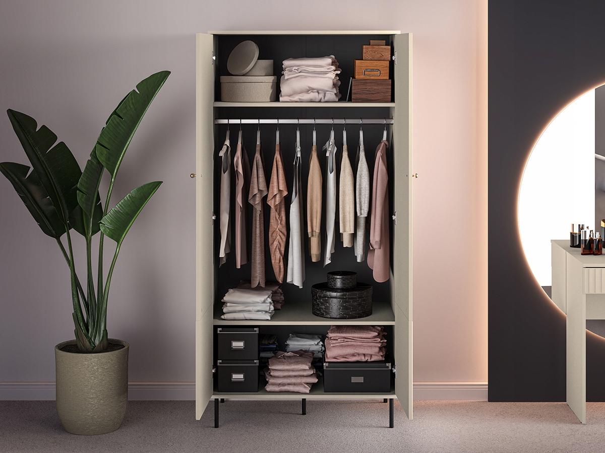 Mimo swoich kompaktowych wymiarów, wnętrze szafy Sophie 01 zostało zaprojektowane tak, aby wycisnąć maksimum z dostępnej przestrzeni: