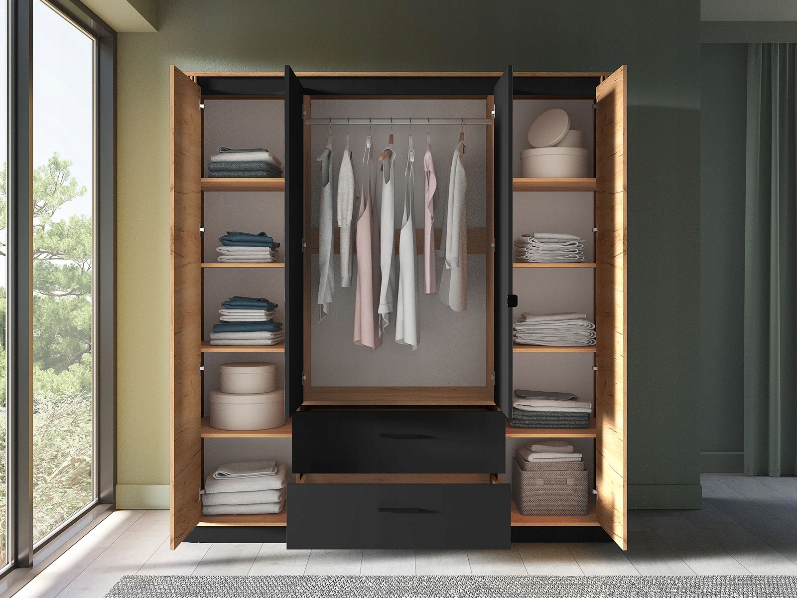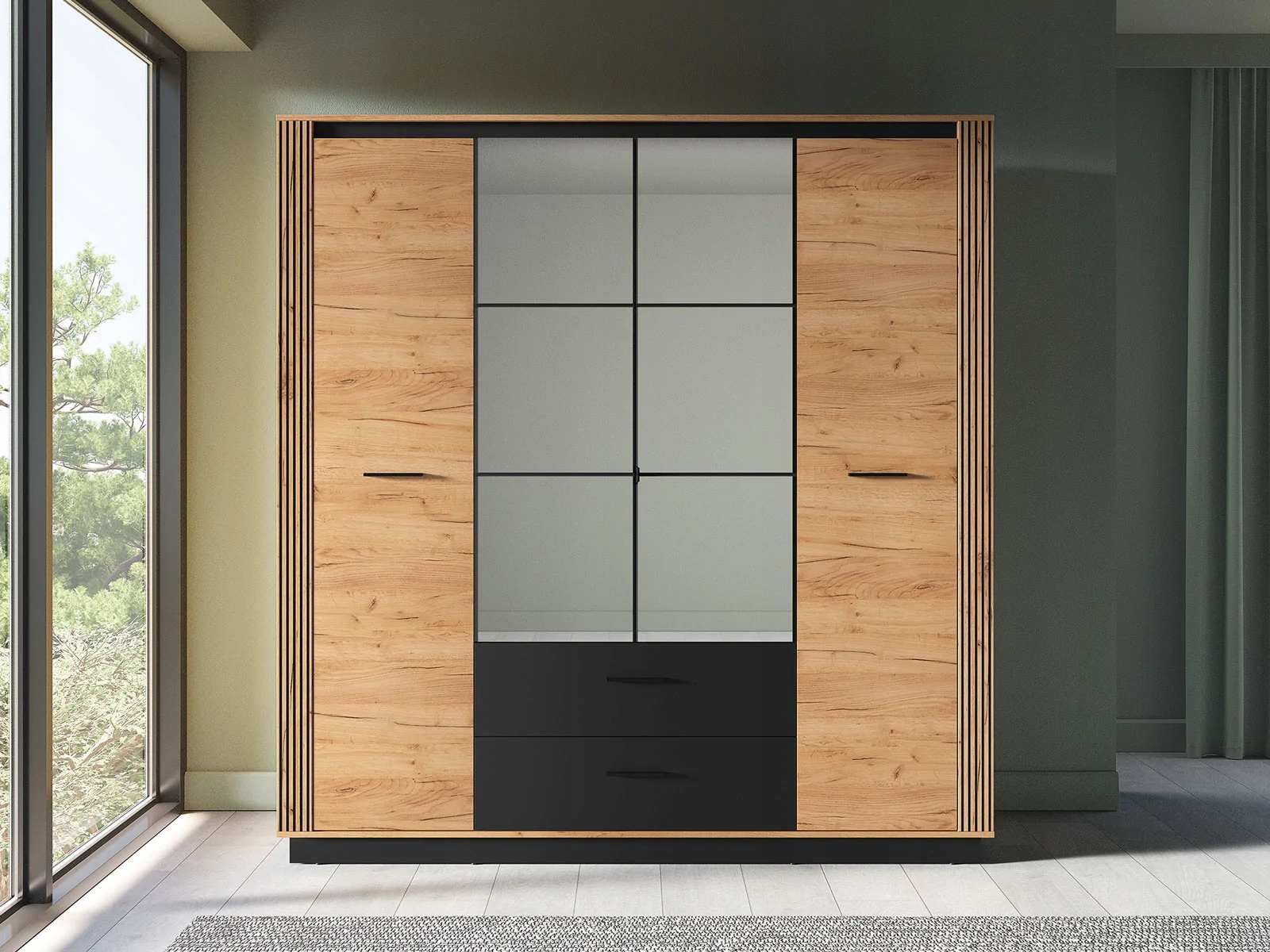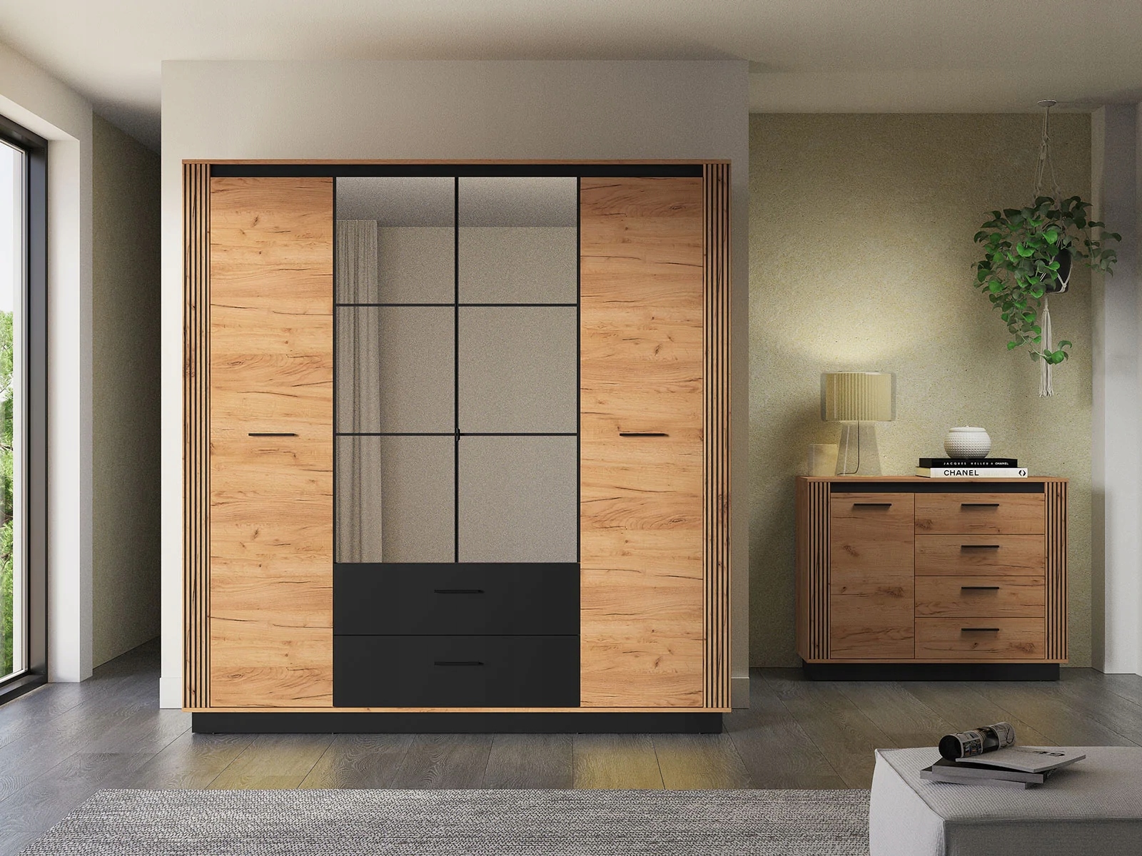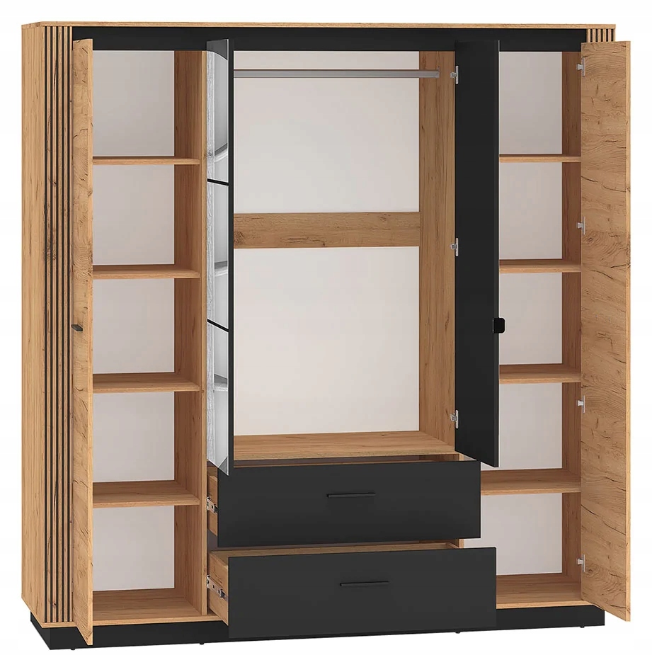 Urso 01 to duża szafa do sypialni lub przedpokoju, oferująca wiele opcji przechowywania dla odzieży, obuwia i dodatków. Mebel wyróżnia się swoim wyrazistym, loftowym designem. Jest utrzymany w naturalnej kolorystyce dębu Craft Złotego z czarnymi akcentami. Charakteru i uroku dodają mu również lamele i minimalistyczne uchwyty.