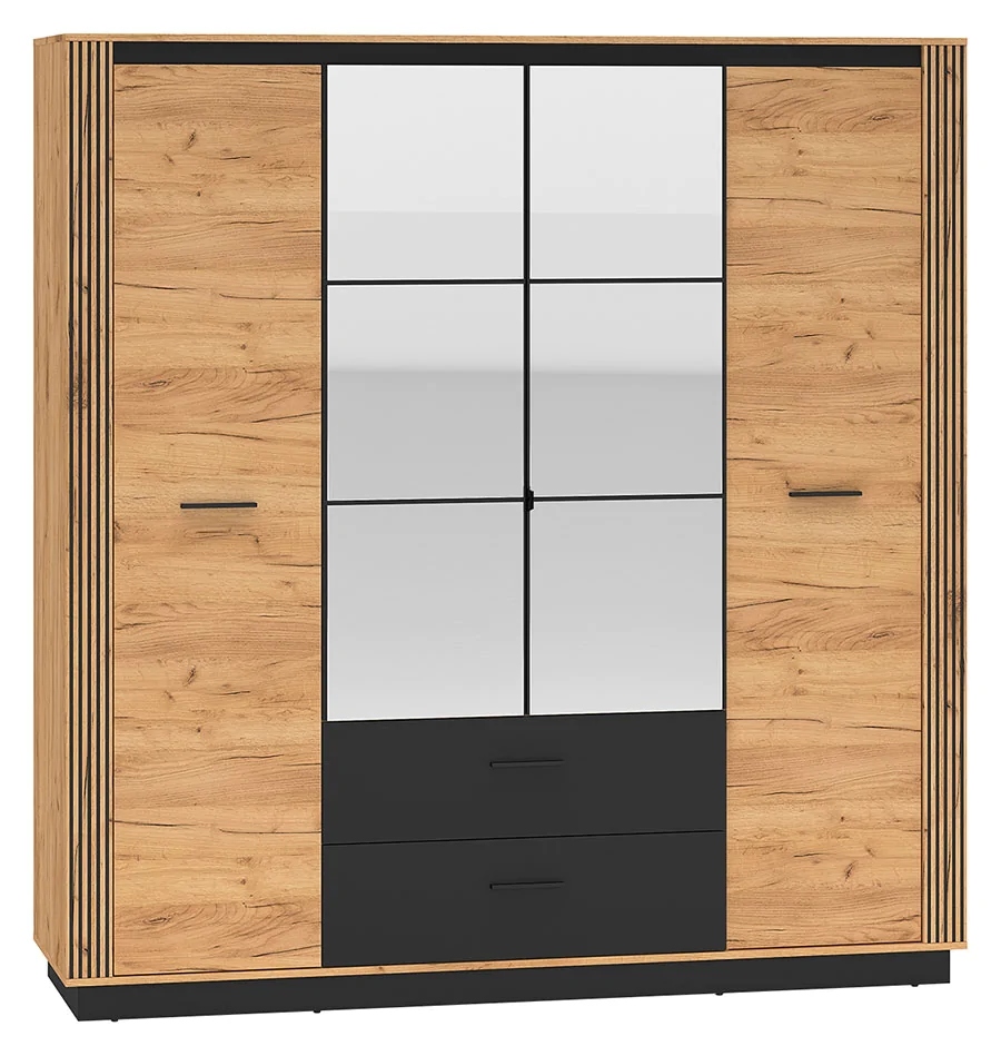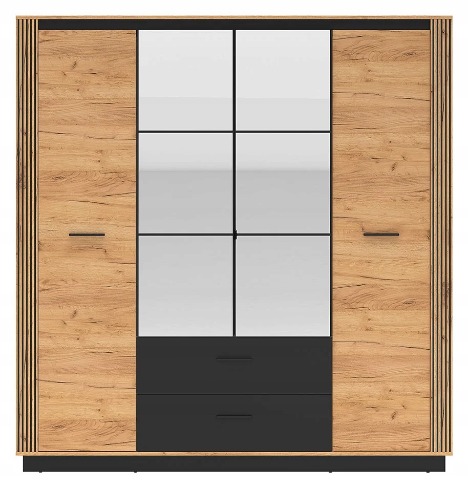 Szafa loftowa Urso 1 została zaprojektowana z myślą o stylu aranżacyjnym loftowym i industrialnym. Mebel charakteryzuje się prostą bryłą i ciekawym wybarwieniem. Jego fronty i korpus mają kolor dębu Craft Złotego, natomiast akcenty ozdobne szafy wykończono na czarny matowy kolor. W bryle mebla intrygujące są również detale, takie jak ciemne podłużne uchwyty czy wstawki z wąskich lameli.