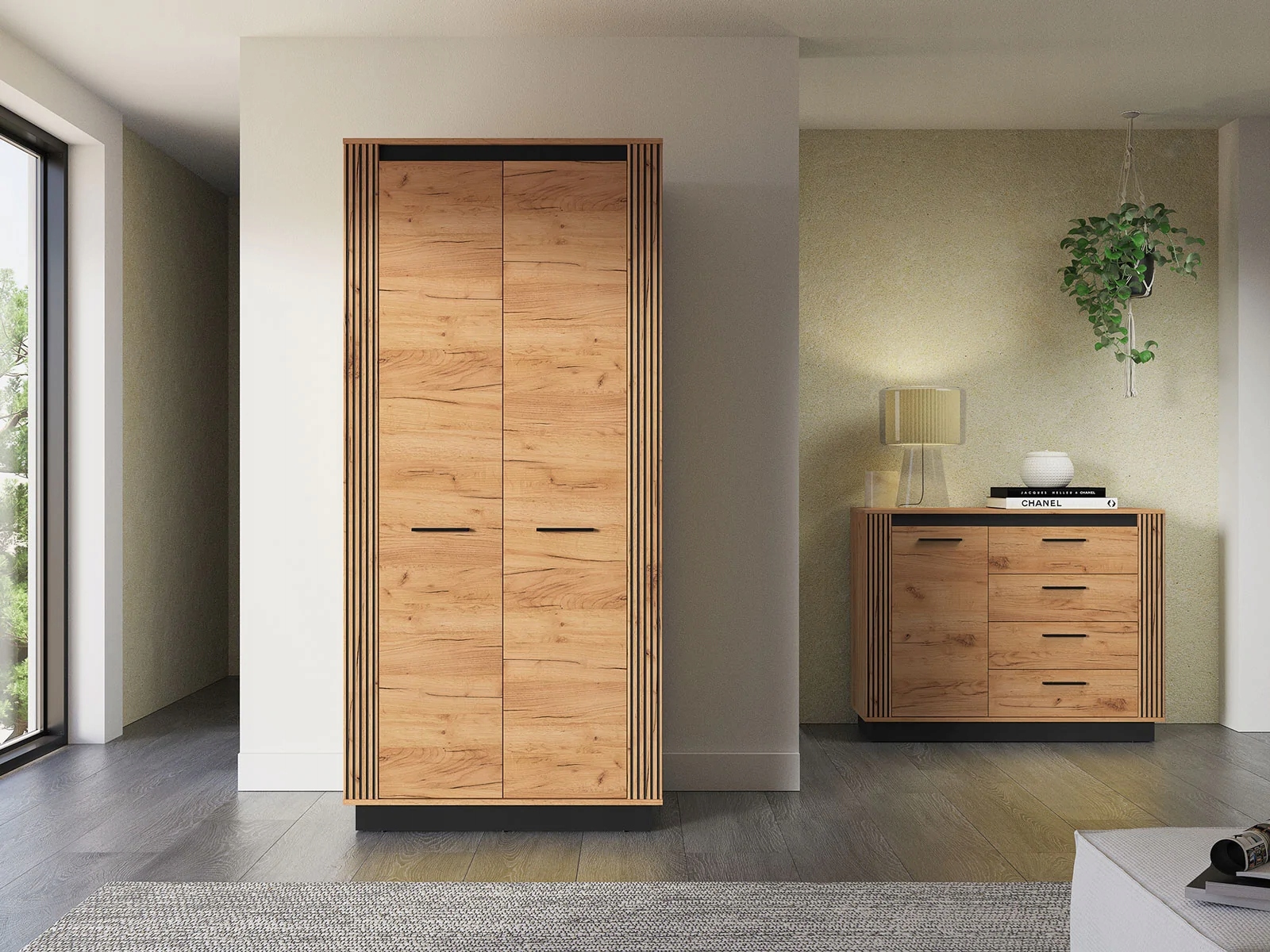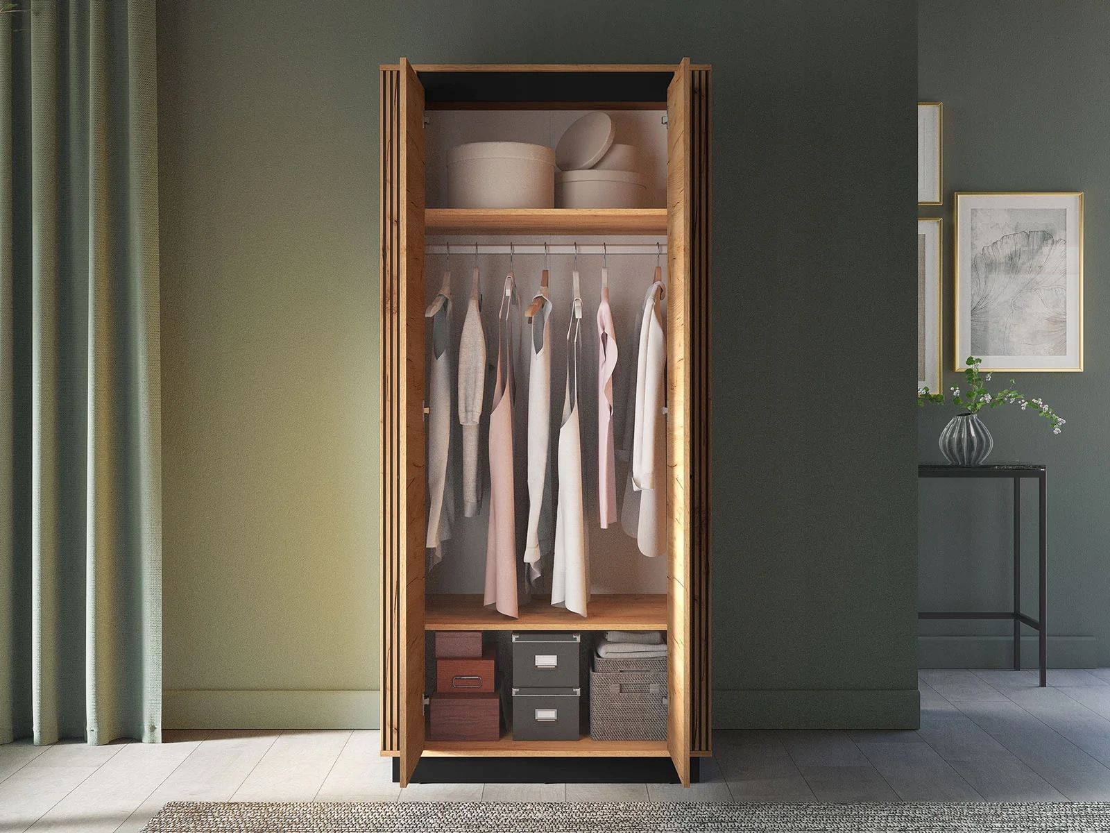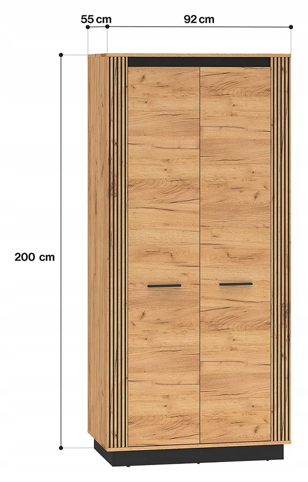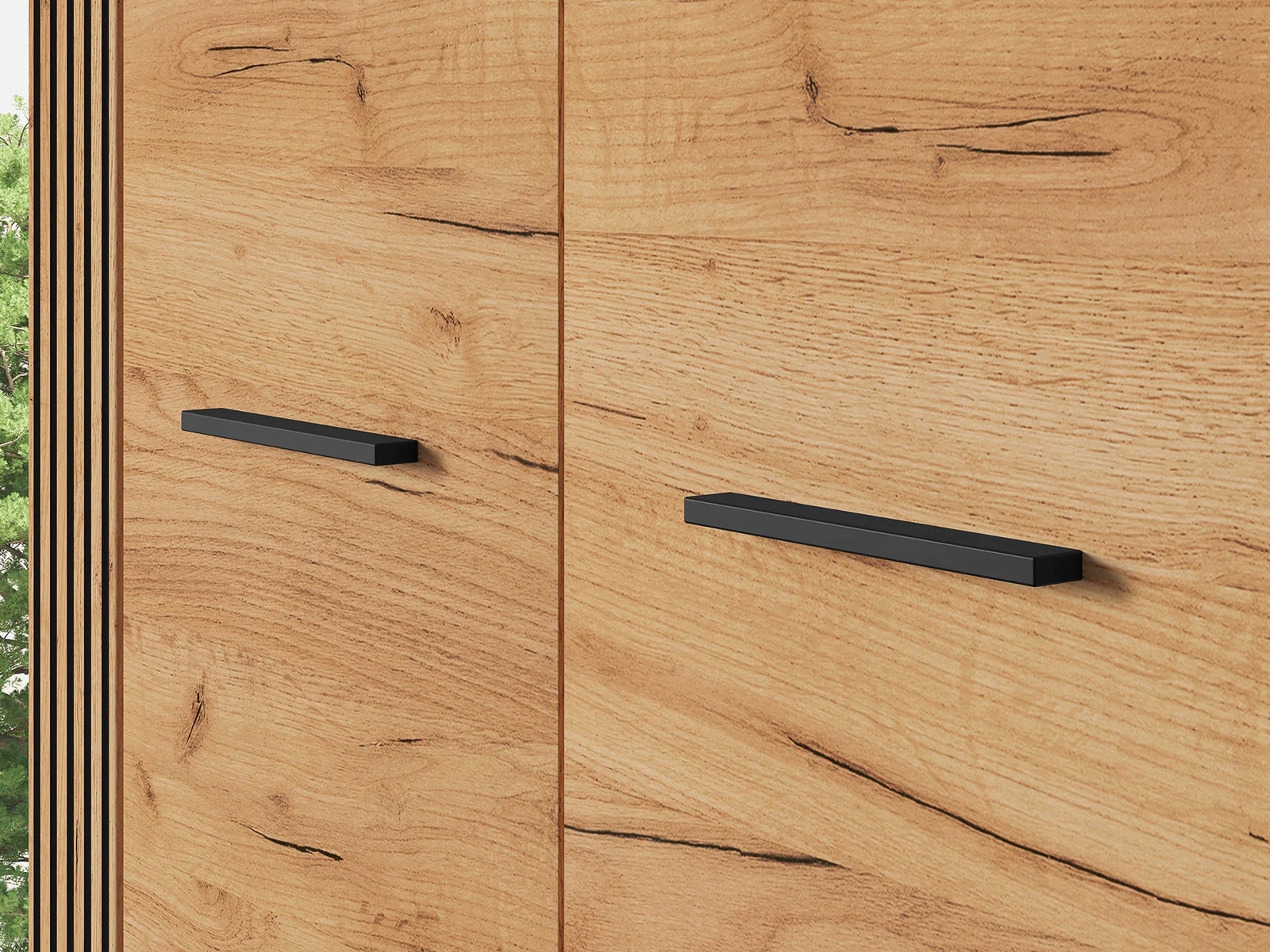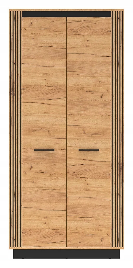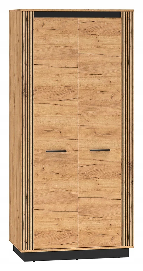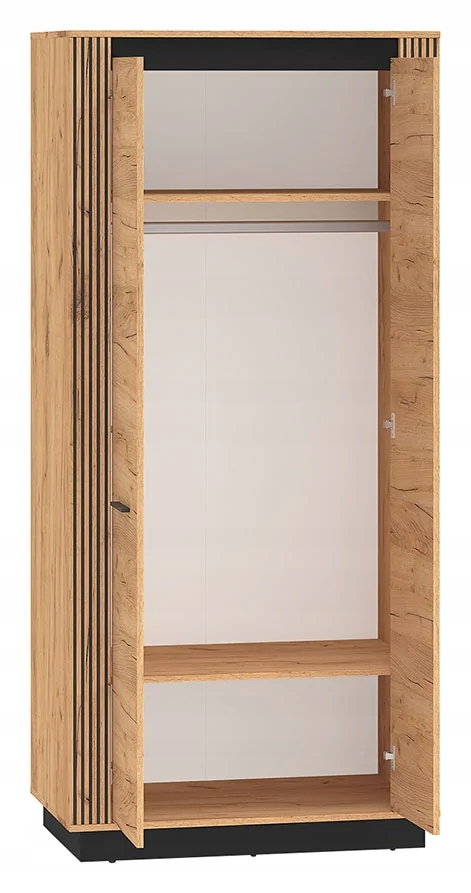 Szafa dwudrzwiowa Urso 03 skrywa w swoim wnętrzu dwie szerokie półki oraz drążek na wieszaki z odpowiednią ilością miejsca do przechowywania okryć wierzchnich i długich kreacji wizytowych. Mebel nie zajmuje wiele miejsca na podłodze, jednocześnie zapewniając sporą przestrzeń na ubrania czy obuwie. Sprawdzi się zatem nie tylko w sypialni, ale też w przedpokoju. Jego dodatkowym atutem okaże się nowoczesny, intrygujący wygląd, uzyskany za sprawą kontrastującego wybarwienia i modnych lameli. Szafa ma barwę dębu Craft Złotego, a jej detale przyjmują wyrazisty czarny kolor, który przyciąga wzrok i nadaje charakter.