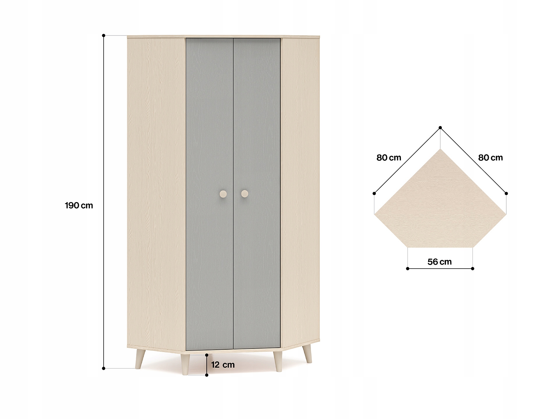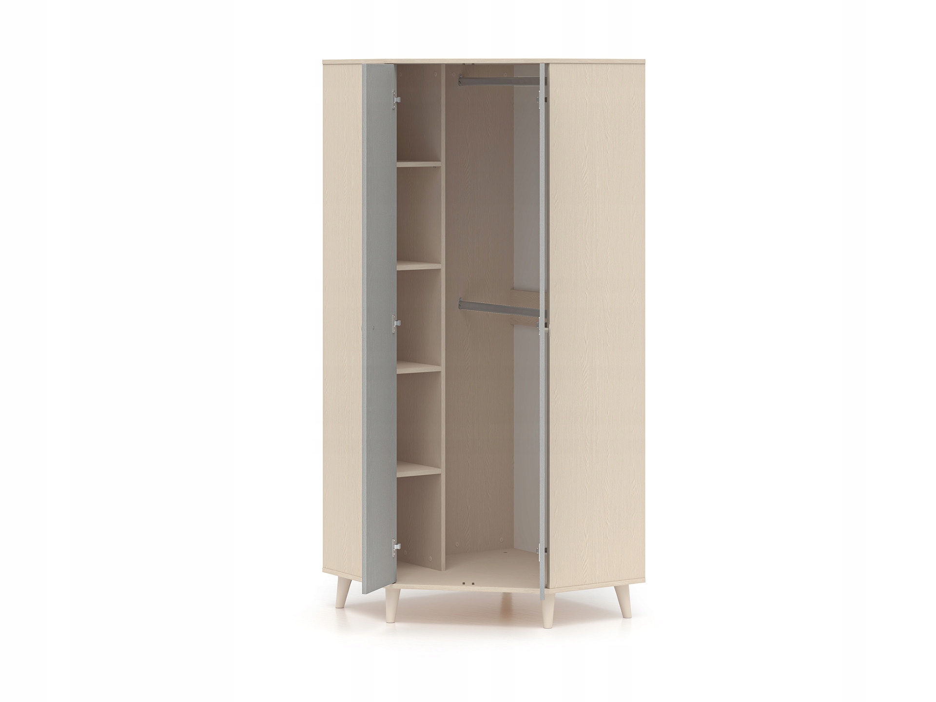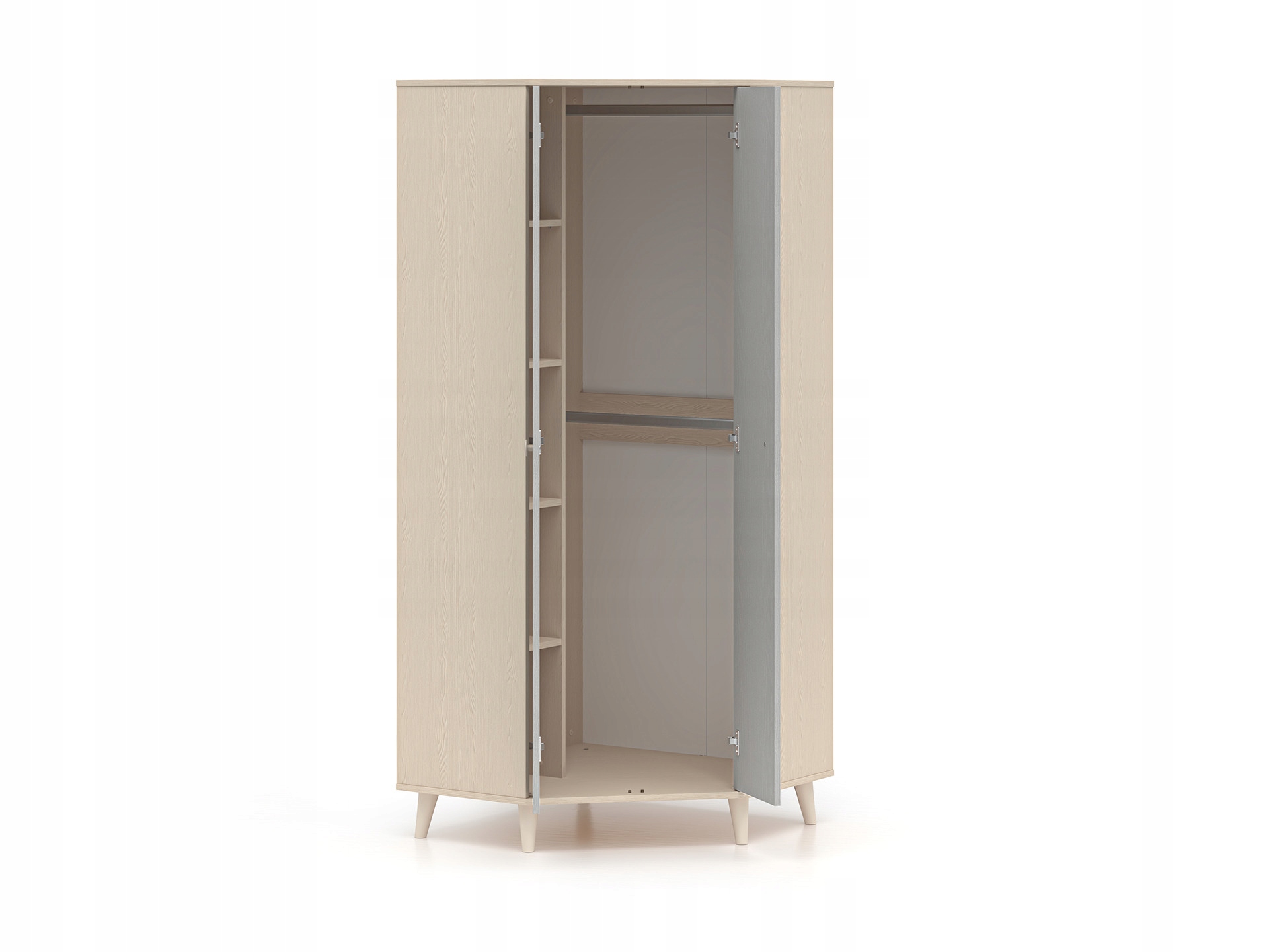 Szafa narożna Mevel 01 od ML Meble todoskonałe rozwiązanie dla osób poszukujących funkcjonalnych i estetycznych mebli do swojego wnętrza. Dzięki narożnej konstrukcji efektywnie wykorzystuje przestrzeń, oferując jednocześnie pojemne miejsce do przechowywania odzieży i innych przedmiotów.