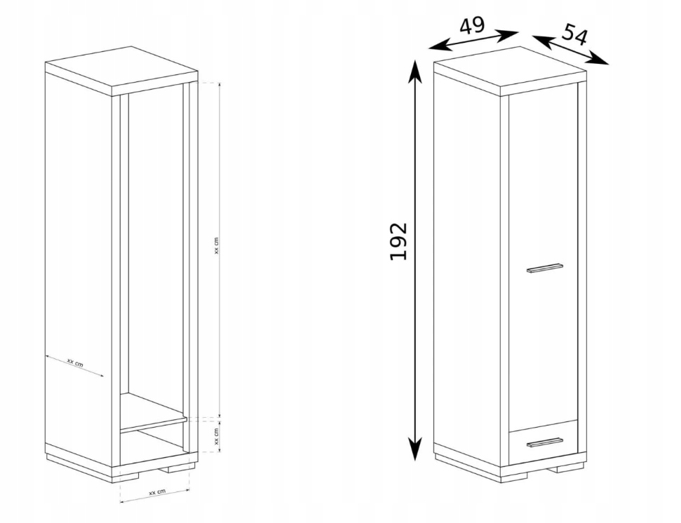 – szafa wąski słupek 49 wewnątrz posiada drążek na wieszaki z ubraniami, ponadto w dolnej części znajduje się szuflada.