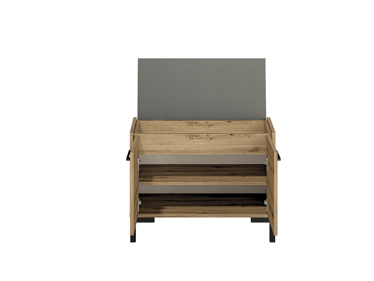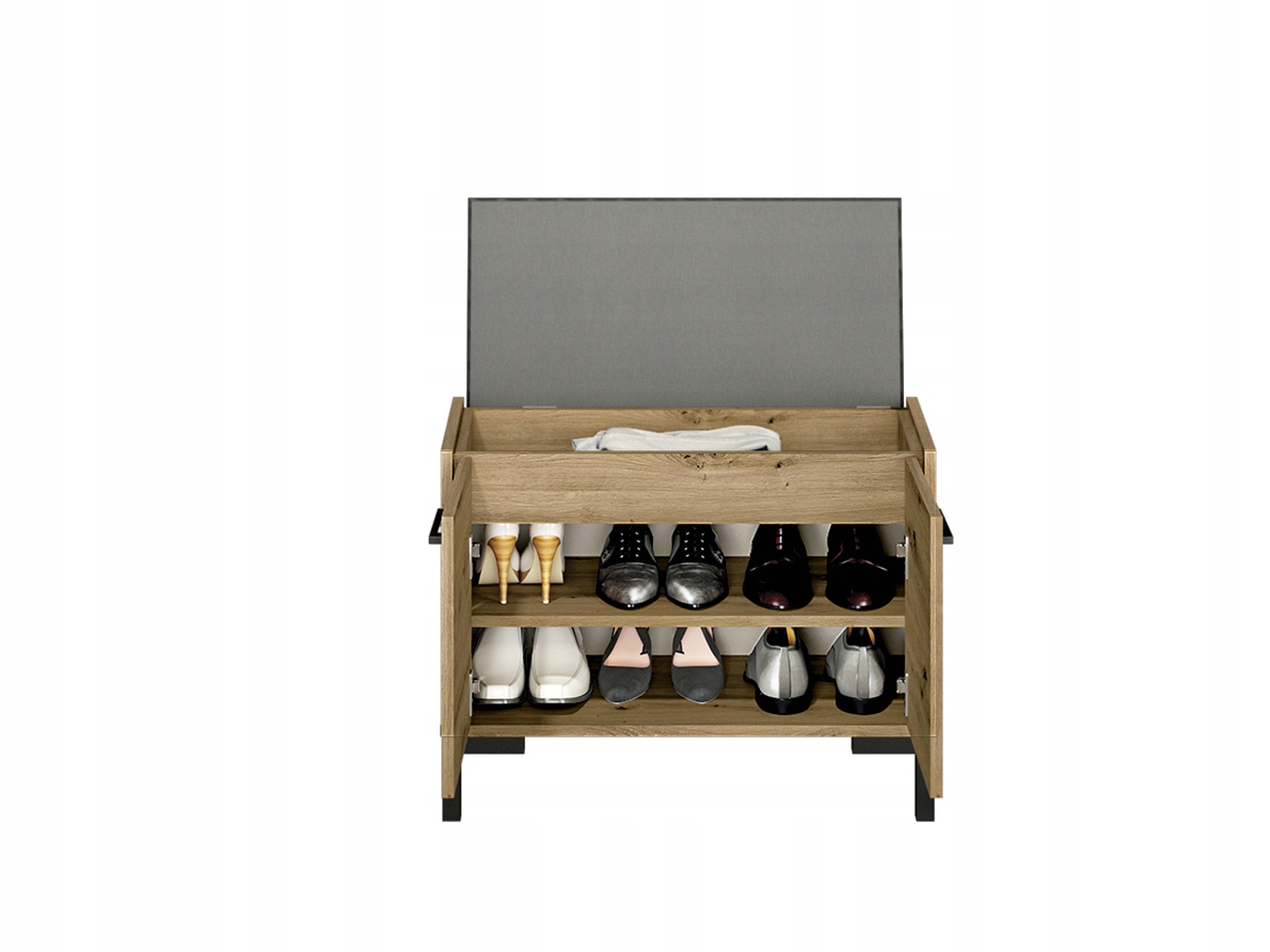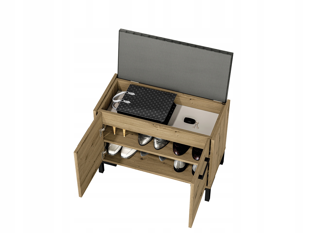 Taki model świetnie odnajdzie się we wnętrzach nowoczesnych, minimalistycznych i loftowych, bez względu na ich układ, kształt czy rozmiar. Zamykana szafka na buty z półkami daje możliwość przechowywania nie tylko obuwia, ale i koszyków z drobnymi akcesoriami.