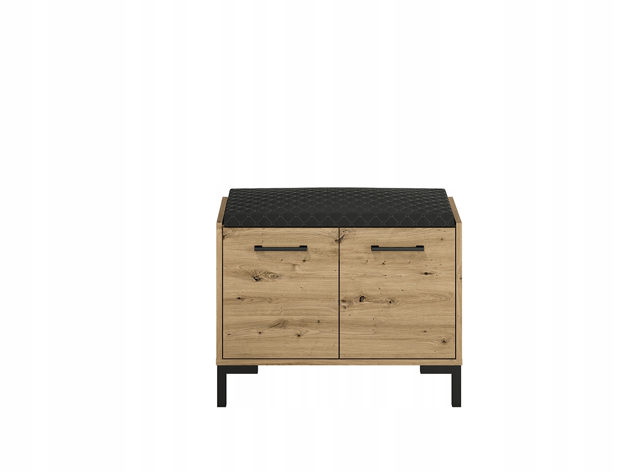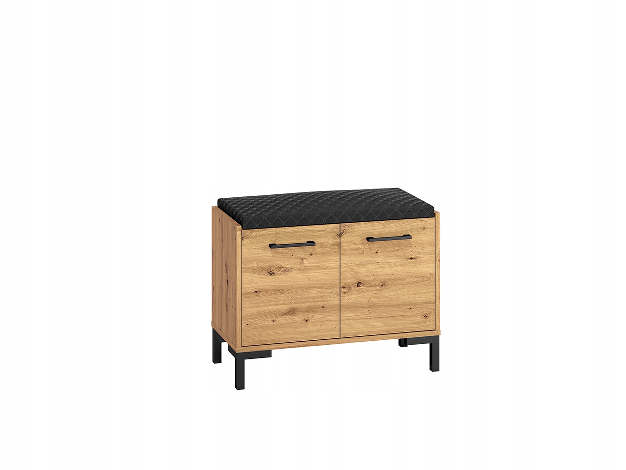 Wykonana z dobrej jakości płyty laminowanej szafka na buty do przedpokoju, została pokryta okleiną w kolorze dąb artisan. Możesz przysiąść na niej na chwilę, aby założyć obuwie lub położyć na siedzisku torebkę, plecak czy siatki z zakupami.