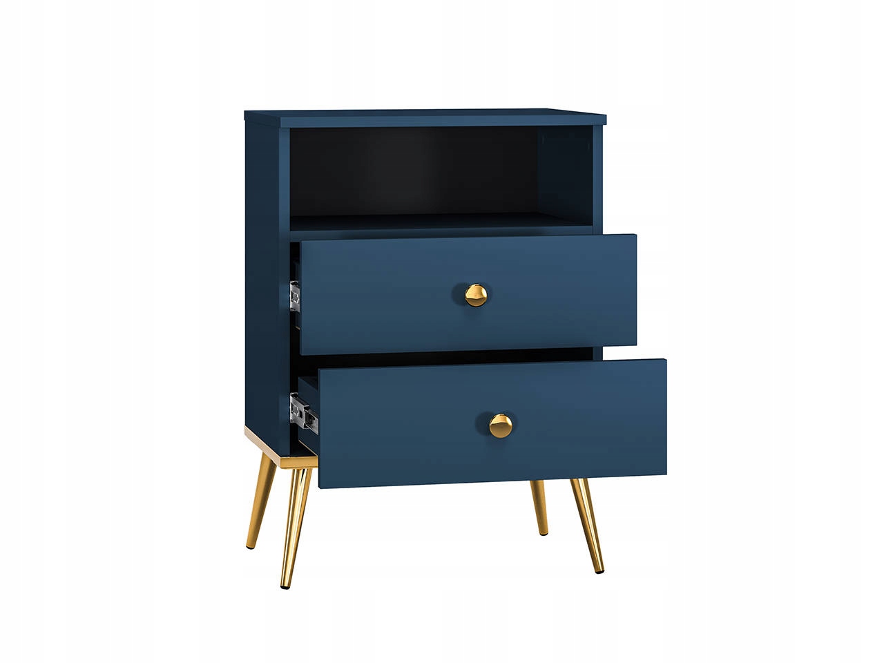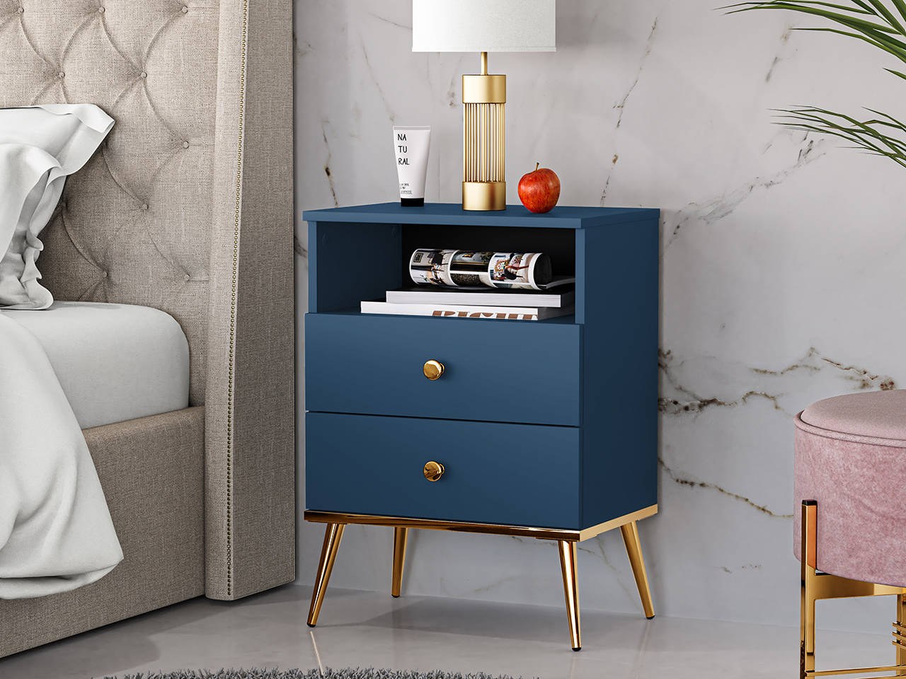 Szafka nocna z wnęką na przechowywanie i dwiema szufladami wykonana z płyty laminowanej w głębokim odcieniu ciemnego błękitu.