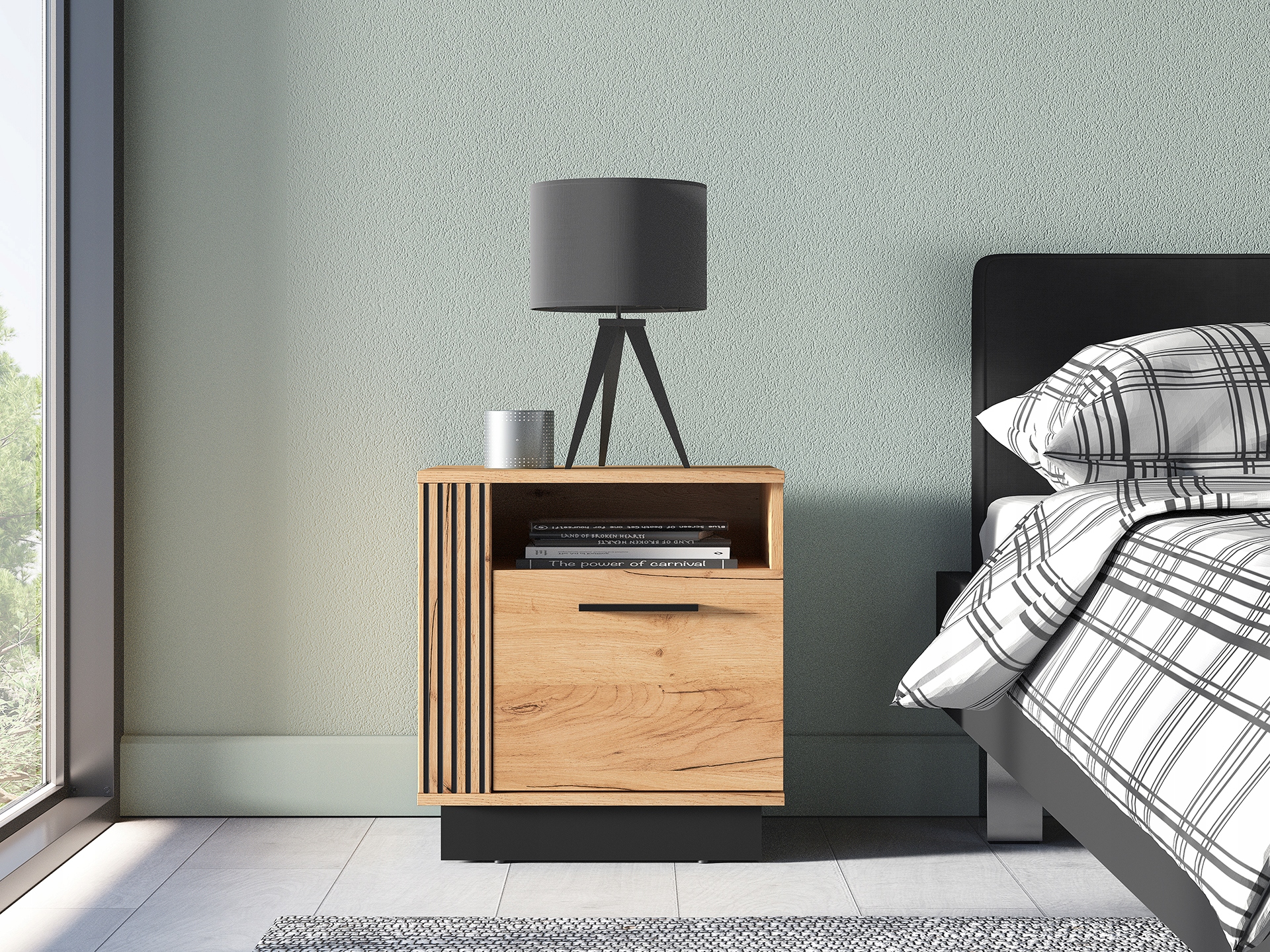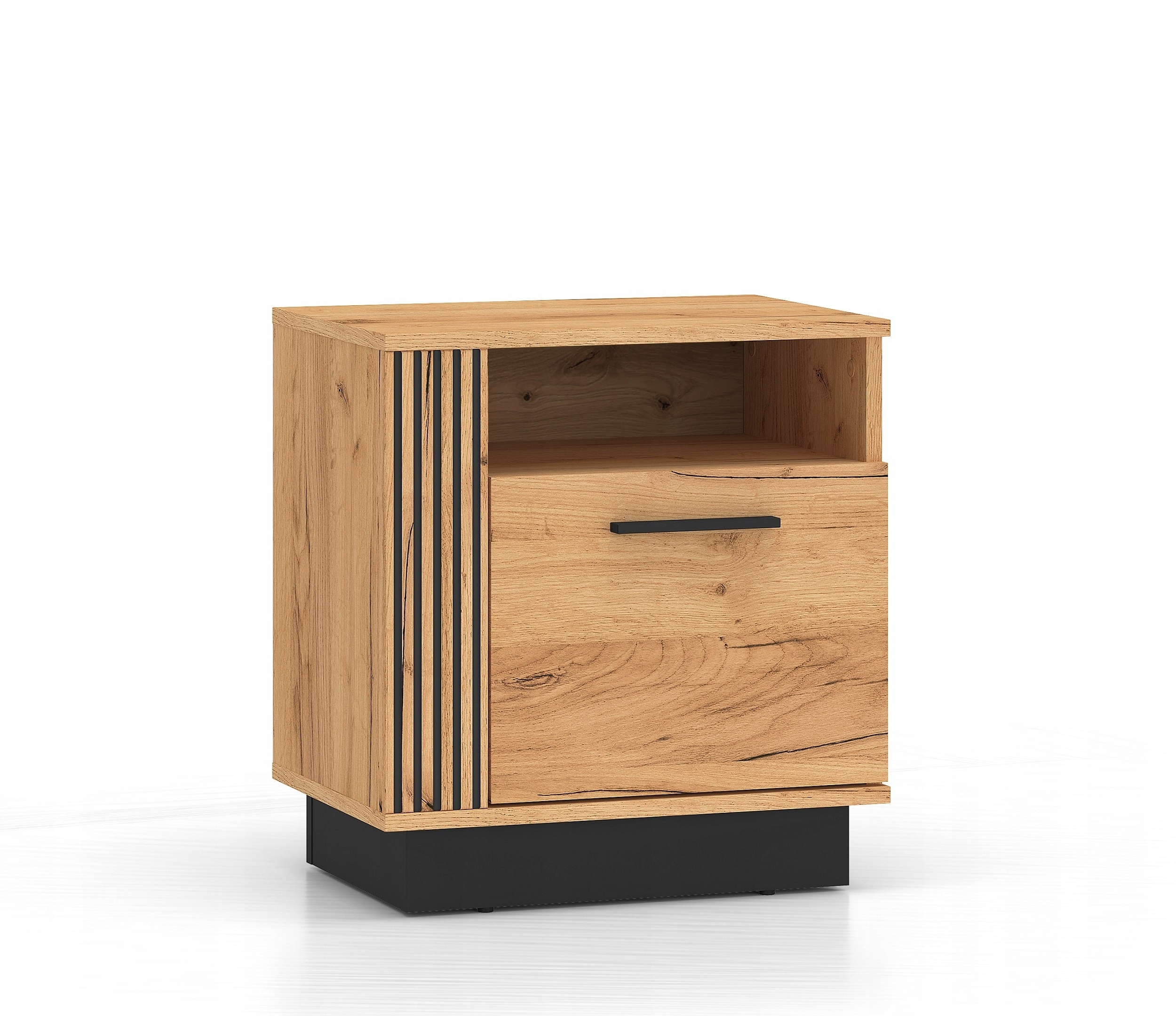 Szafka nocna Urso 09 to niezbędny mebel przy Twoim łóżku. Dzięki blatowi na odpowiedniej wysokości masz wszystko, czego potrzebujesz zawsze pod ręką. Do otwartej wnęki odłożysz czytane gazety czy książki. Dolna część mebla to zamykana, pojemna przestrzeń do przechowywania. Design mebla Urso 06 łączy ze sobą klasyczny styl dębowego wzoru z nowoczesnym twistem w postaci czarnych elementów. Oryginalne, frezowane wstawki podkreślają nietuzinkowość wszystkich brył z kolekcji Urso.