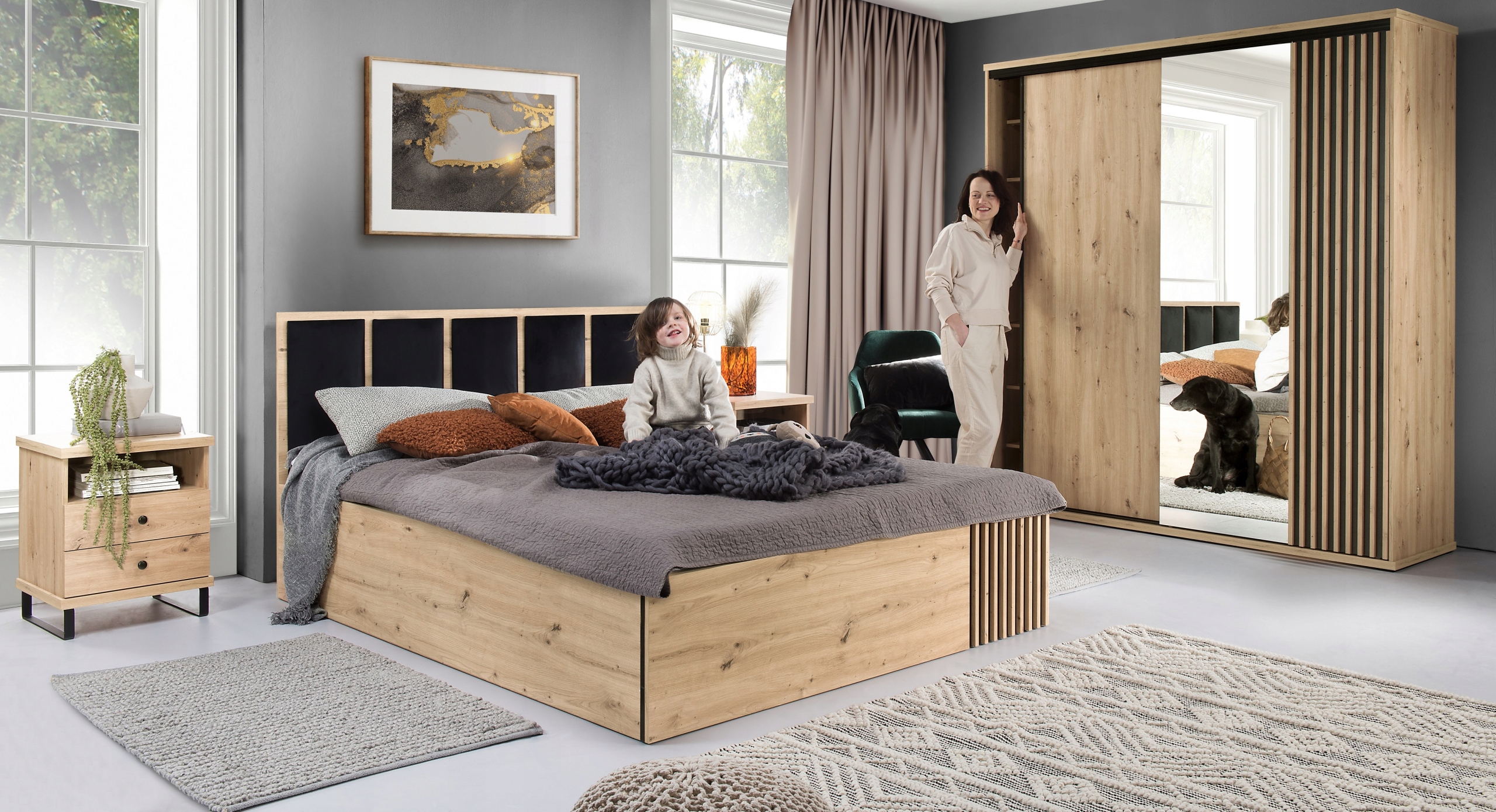 Zaletą systemu CALI jest fakt posiadania sporej liczby elementów, wchodzącej w jego skład. Sprawia on, że możemy świetnie zaprojektować wnętrze naszego salonu, sypialni a także biura lub gabinetu. Specjalnie dobrana tekstura oraz ciepłe naturalne wybarwienie koloru artisan w połączeniu z czarną, matową płytą i lamelami, podkreślają nowoczesny styl całej kolekcji. Wysoka dbałość o najmniejsze szczegóły i niepowtarzalne, oryginalne wykończenie, z pewnością zadowoli najbardziej wymagających Klientów.