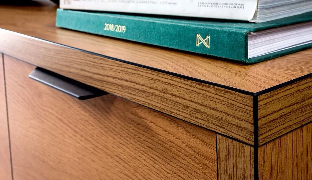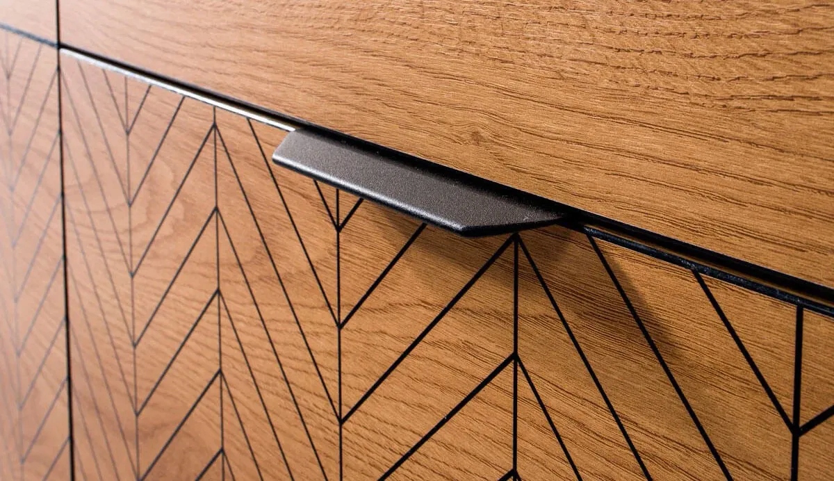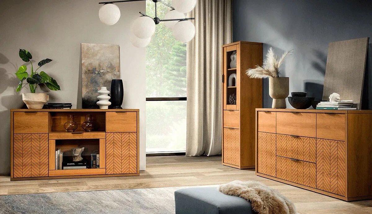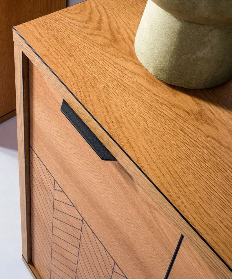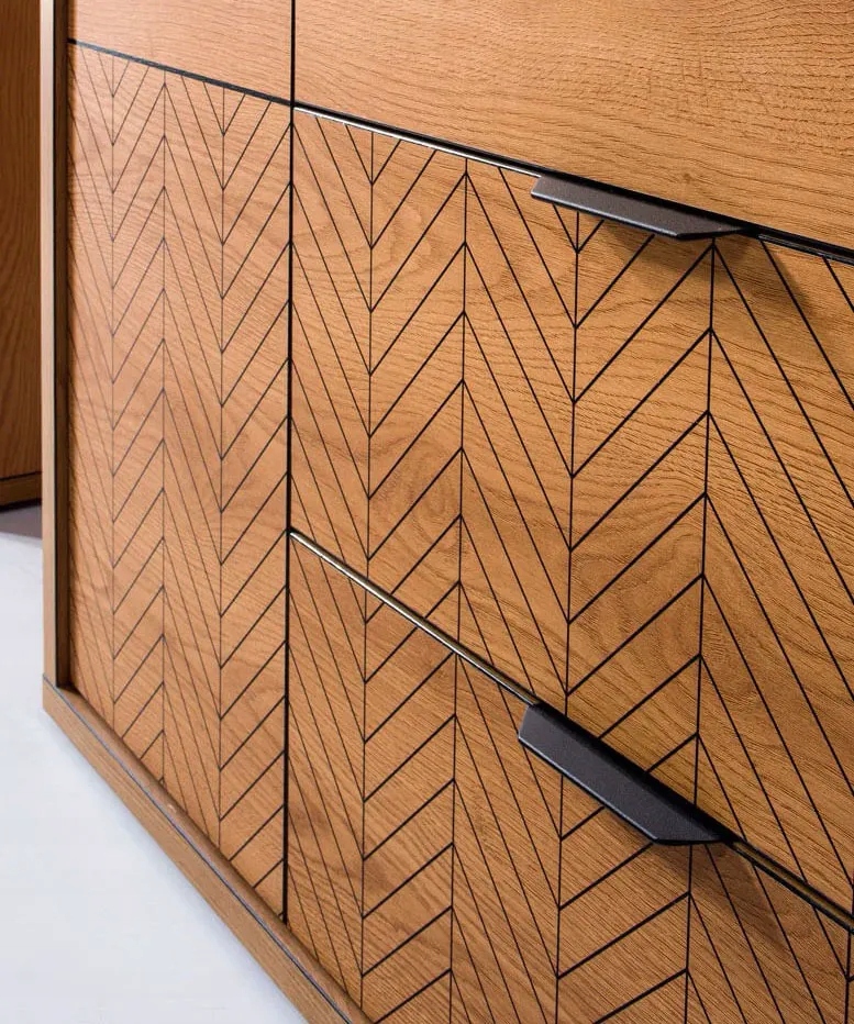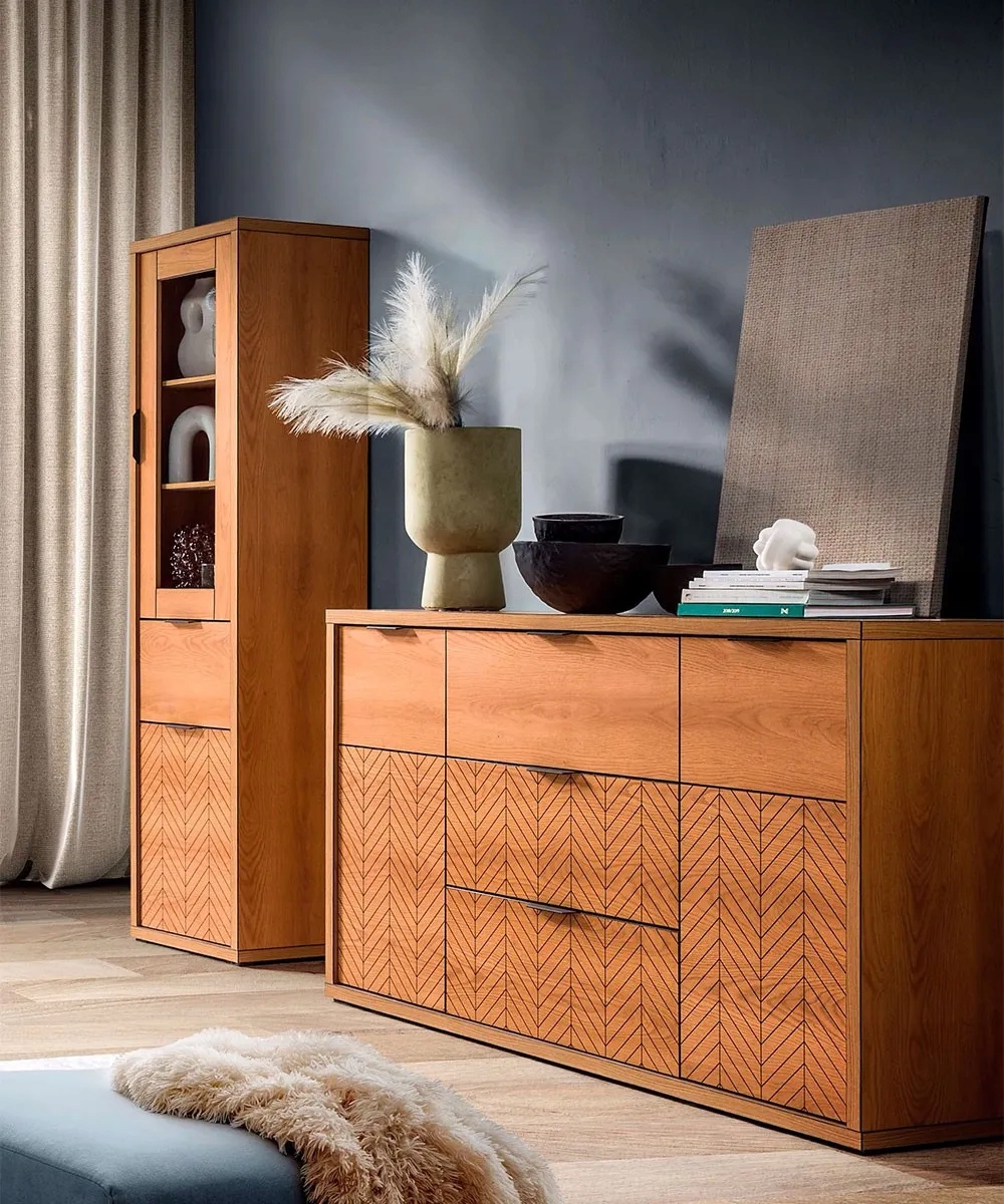 Kolekcja, która jest nowoczesną elegancją. Proste i funkcjonalne bryły, sprawdzą się w salonie sypialni i jadalni. Proste bryły, klasyczny, naturalny kolor, to sposób na aranżację wnętrz w nowoczesnych domach. Cechą charakterystyczną mebli jest misterne zdobienie w postaci jodełki.Naturalny kolor mebli, jakim jest dąb karmel. Meble z niepowtarzalnym, czarnym wykończeniem brzegów brył. Innowacyjne rozwiązanie w kolekcji Fonti. Naturalny, ciepły, karmelowy kolor, będzie pasował do każdego wnętrza. Czarne matowe uchwyty dodają nowoczesnego wyglądu kolekcji. Meble zdobi wzór na frontach w postaci czarnej jodełki. Zdobienia stają się tu eleganckim detalem przyciągającym wzrok. Kształt mebli sprawia, że pasują do wielu aranżacji. Meble te mają wyraźne, geometryczne kształty i harmonijne proporcje. Dąb karmel to estetyczny i elegancji kolor do wnętrza, to kolor natury. Meble w salonie w takim kolorze zachwycą Twoich domowników i gości.