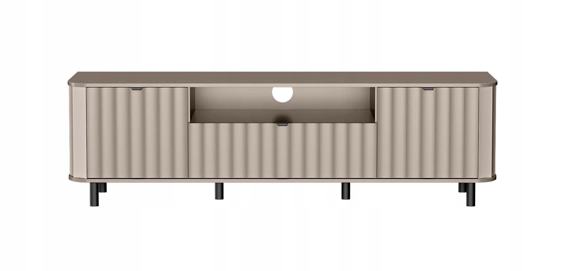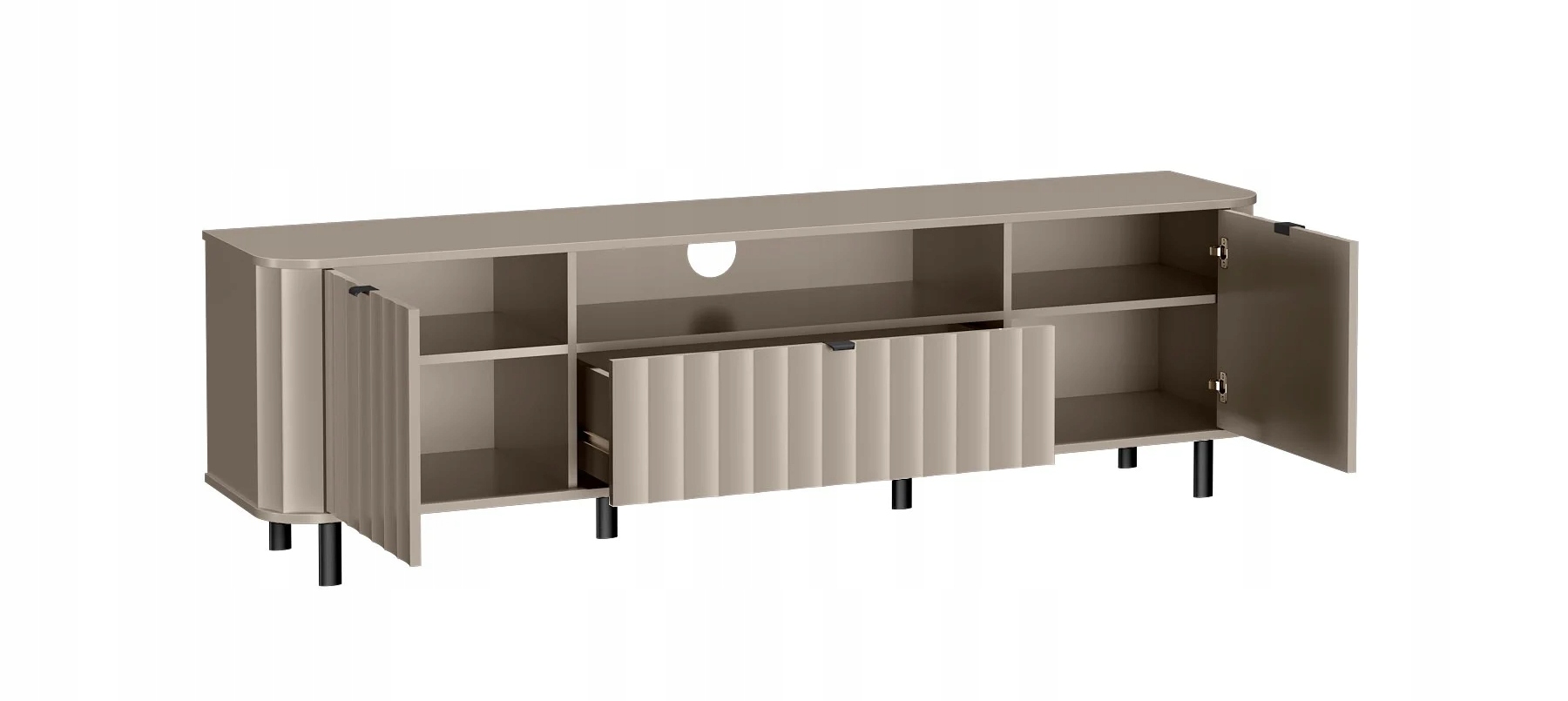 Nowoczesna szafka RTV z tej serii została zaprojektowana z myślą o codziennym komforcie użytkowania – szeroki blat pomieści duży ekran, a poniżej znajdziemy przemyślane miejsce do przechowywania: wnęki na dekodery, konsolę czy soundbar, oraz zamykane szafki na drobiazgi, które chcemy mieć pod ręką, ale nie na widoku.