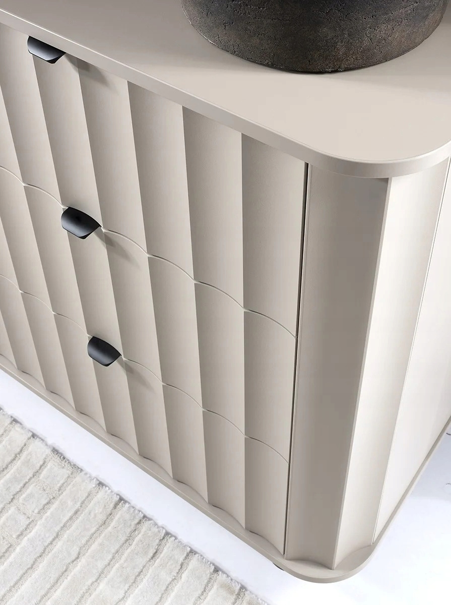 Meble NOVADO wyróżnia geometryczna, prosta forma, subtelne detale i lekka bryła oparta na wyższych, owalnych nogach. Dzięki temu szafka prezentuje się nowocześnie i nie przytłacza wnętrza. Jej neutralna kolorystyka z łatwością dopasuje się do różnego typu aranżacji – od skandynawskich, przez loftowe, aż po współczesne wnętrza z nutą minimalizmu.