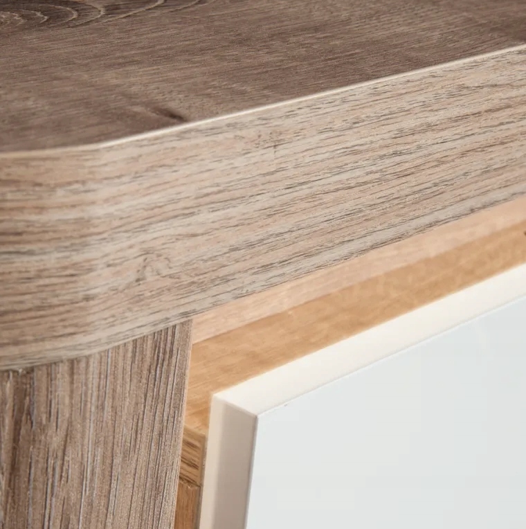 Obrzeże szafki zostało wykończone okleiną ABS , zapewniającą dodatkową ochronę oraz estetyczny wygląd. Tył szafki wykonany jest z płyty HDF , co dodatkowo wzmacnia jej konstrukcję.