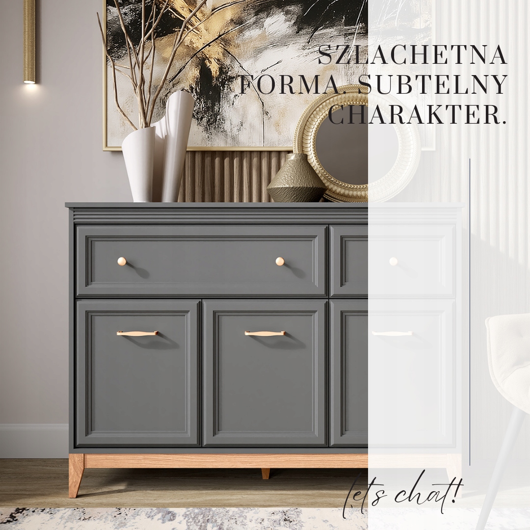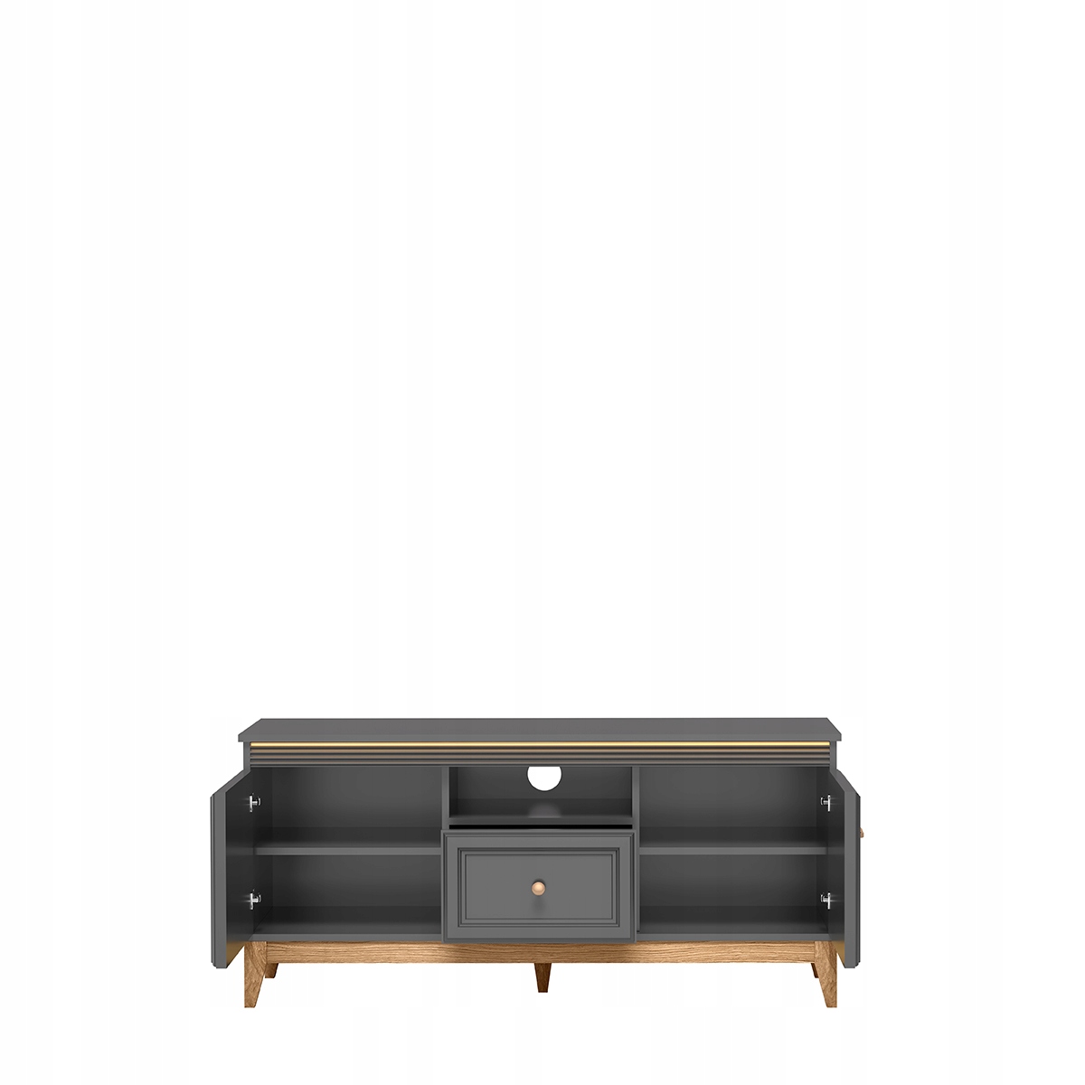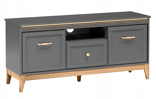 Charakterystyczny dla kolekcji Szary Diamentowy kolor frontów tworzy spokojne, eleganckie tło dla sprzętu RTV. Naturalne drewniane nogi dodają konstrukcji lekkości wizualnej, a metalowe uchwyty w kolorze różowego złota wprowadzają subtelną nutę luksusu.