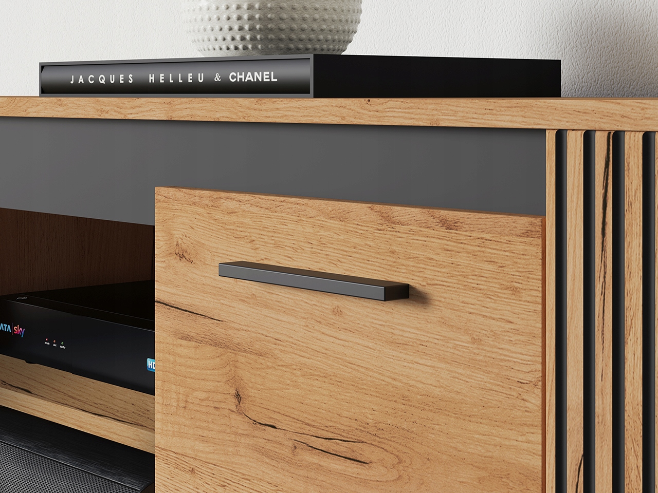 Szafka RTV Urso 08 to idealny mebel pod Twój telewizor. Dwie zamknięte wnęki tworzą bardzo pojemną przestrzeń do przechowywania, a otwarte półki oraz szeroki blat w prosty sposób pomogą uporządkować Twoje sprzęty multimedialne. Design mebla Urso 06 łączy ze sobą klasyczny styl dębowego wzoru z nowoczesnym twistem w postaci czarnych elementów. Oryginalne, frezowane wstawki podkreślają nietuzinkowość wszystkich brył z kolekcji Urso.
