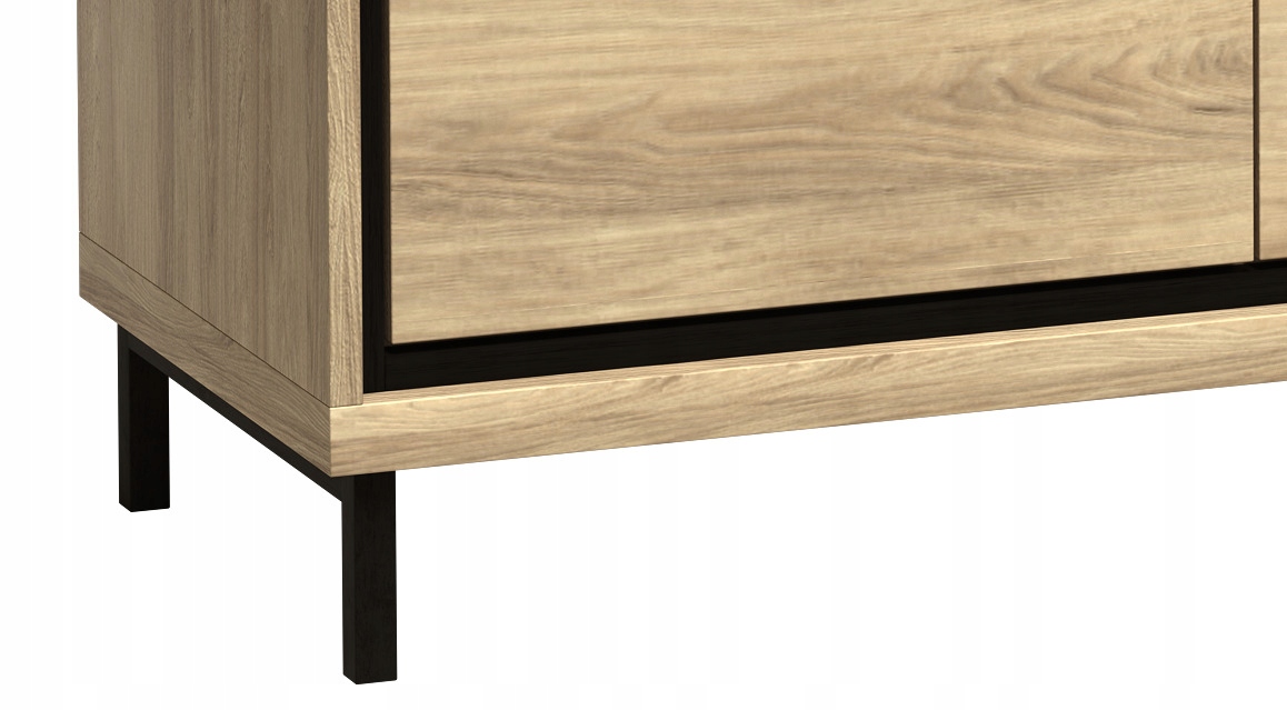 Duża szafka RTV o szerokości aż 181 cm. W bocznych szafkach znajdują się półki ułatwiające porządkowanie. Zawiasy, jakie zastosowano w drzwiach to najwyższej jakości zawiasy z cichym domykiem. Mebel posiada również jedną szufladę, otwieraną na dotyk. Znajduje się tam również półka, która urozmaica wygląd mebla. Ciemne uchwyty i czarna listwa dookoła mebla tworzą nietypowe, lecz nowoczesne połączenie ocieplające wnętrze. Dostępny kolor szafki to natural hikora. Bardzo jasny, przytulny odcień drewna. Łącząc go z ciemnymi dodatkami uzyskamy industrialny styl wnętrza. Szafka pod telewizor to centrum każdego salonu. Warto postawić na produkt najwyżej jakości. Mebel, który zachwyci naszych gości. Każdy oglądany film będzie przyjemniejszy przy dodatkowym oświetleniu szuflady w szafce telewizyjnej.