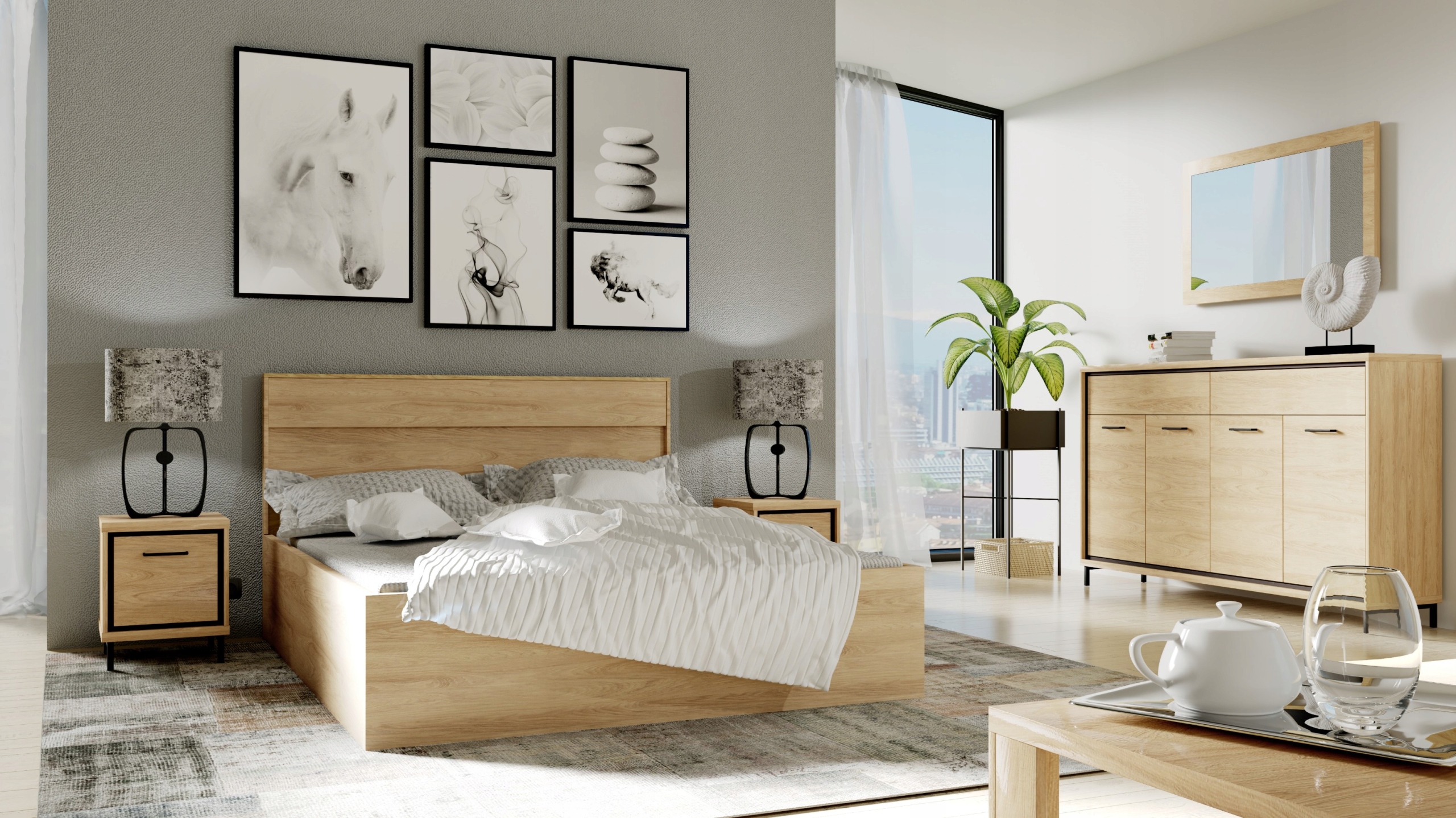 Zestaw mebli Italia został wykonany w popularnym, ciepłym kolorze natural hikora, który w połączeniu z loftowymi, czarnymi wstawkami tworzy niezwykłe połączenie. Nowoczesny design wpasuje się zarówno do salonu, sypialni czy pokoju młodzieżowego. Zestaw Italia to uniwersalne rozwiązanie do domu oraz biura!