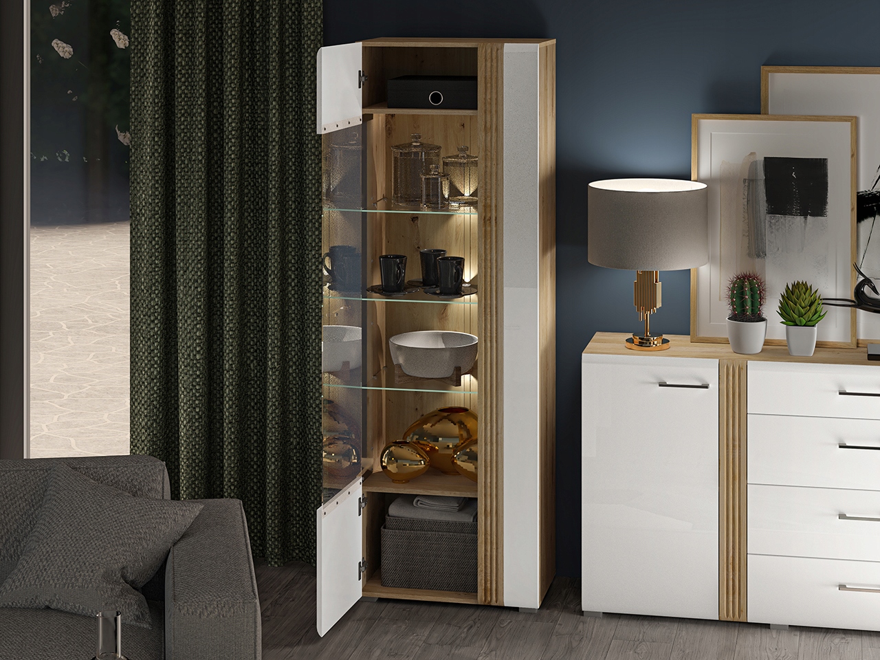 Witryna 02L z kolekcji ADAGIO to elegancki i funkcjonalny mebel. Doskonale wpasuje się w nowoczesne wnętrza, łącząc estetykę z praktycznością. Jej front wykonany z wysokiej jakości płyty MDF w białym połysku. Piękne szklane drzwi. Szklane półki podświetlone LED. Nadaje jej nowoczesny i elegancki wygląd, idealnie komponujący się z różnymi stylami aranżacji. Korpus w kolorze dąb castello dodaje wnętrzu ciepła i naturalnego charakteru, tworząc harmonijną całość.