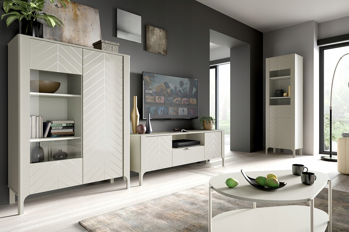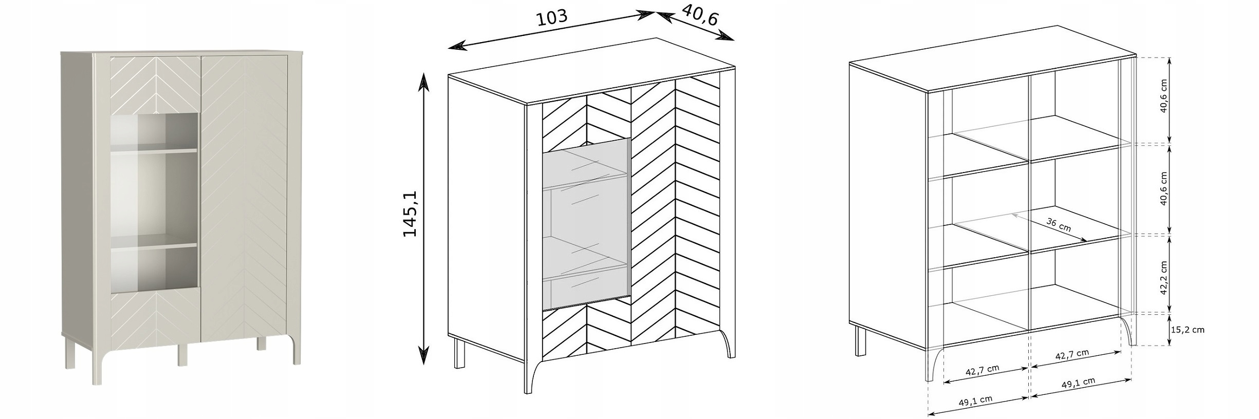 Witryna MALUMI kaszmir Cashmere 145 x 103 x 40,6 nowoczesna, jodełka beżowa