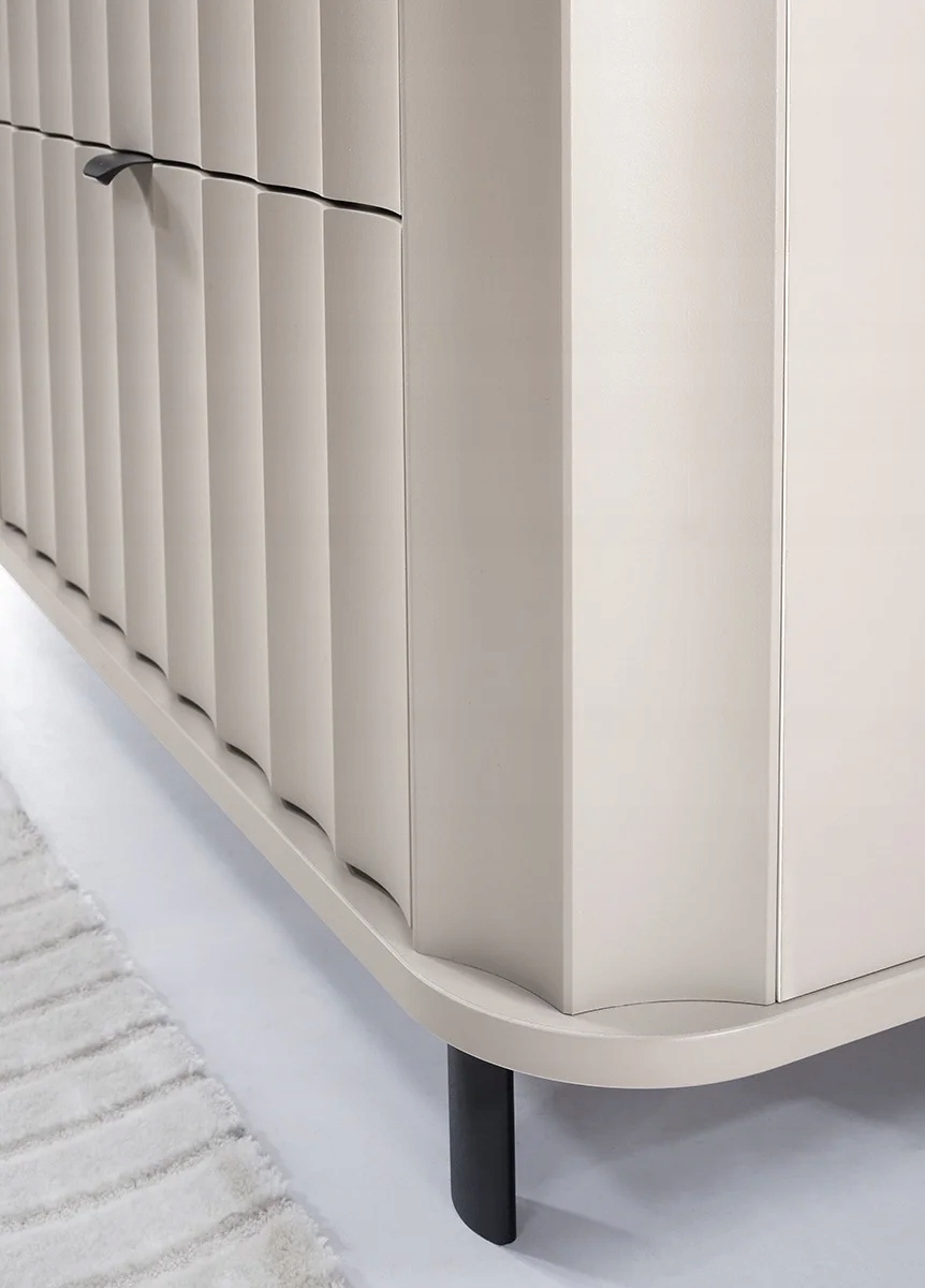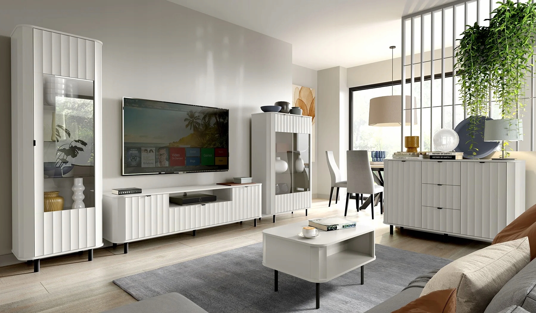 Meble wyróżniają się smukłą, lekką bryłą, która doskonale komponuje się zarówno z minimalistycznymi, jak i bardziej klasycznymi aranżacjami. Kluczowym elementem kolekcji są delikatnie zaokrąglone blaty, dodające meblom subtelności i miękkości w odbiorze wizualnym. Dzięki nim wnętrze zyskuje przytulny, a zarazem uporządkowany charakter.