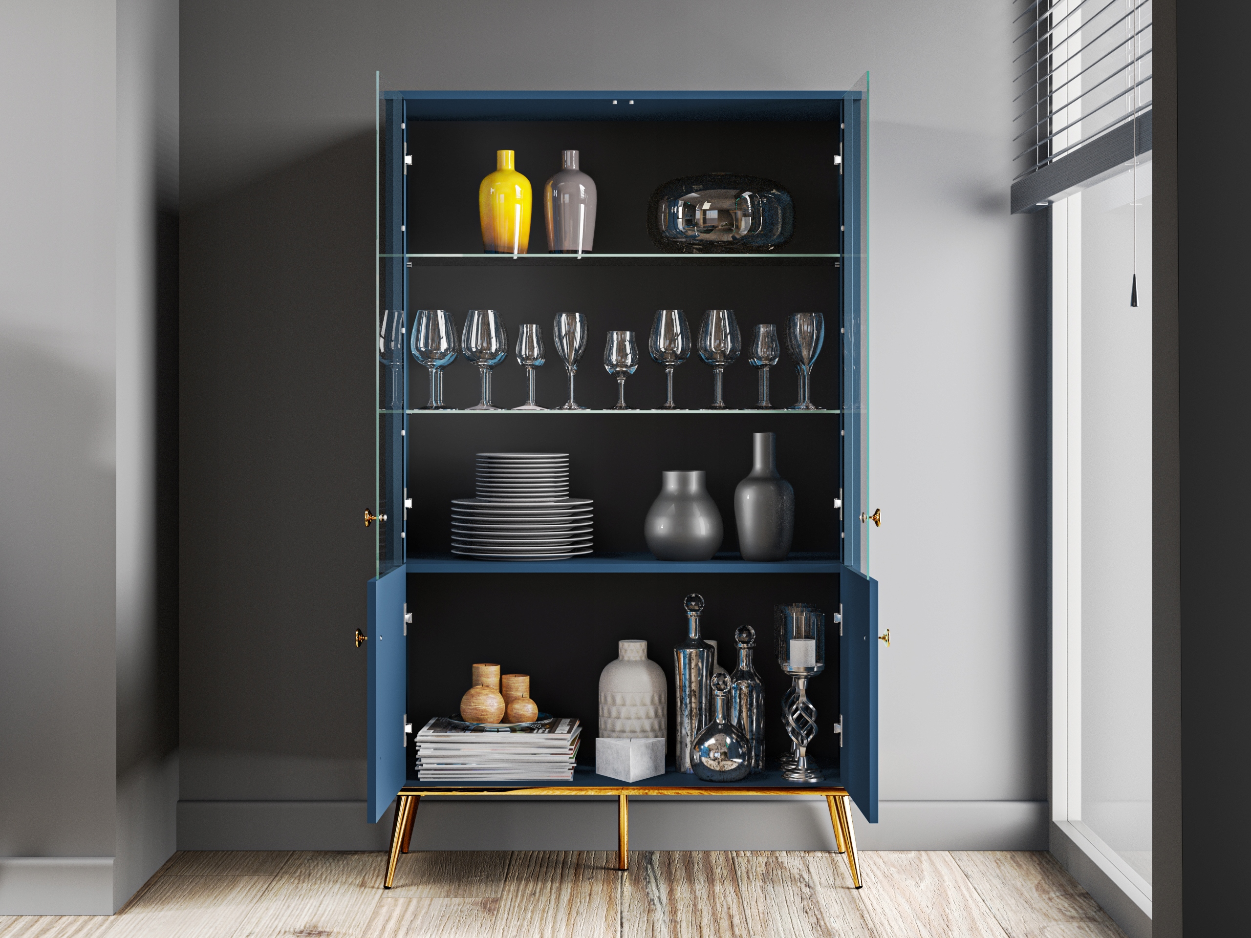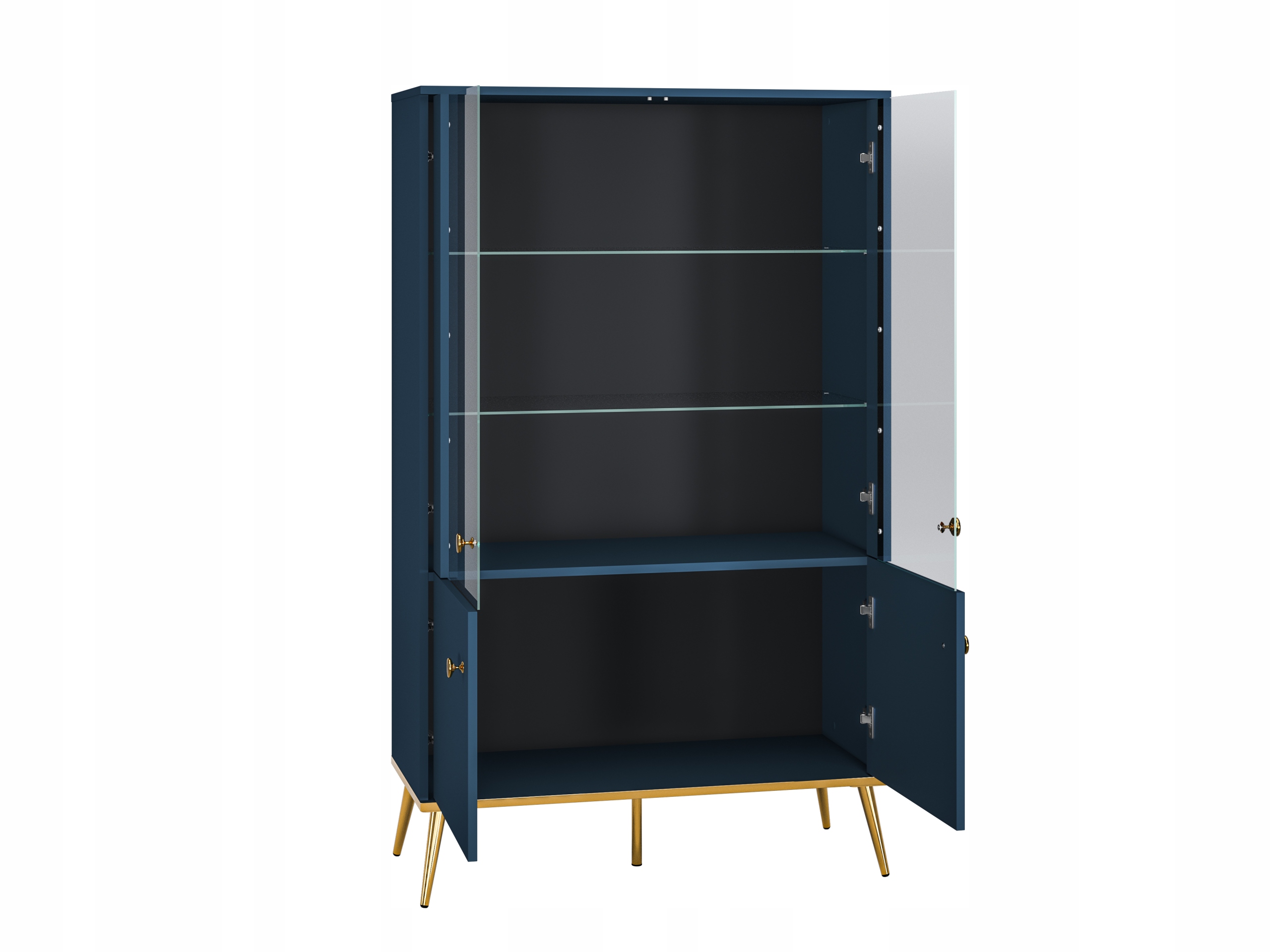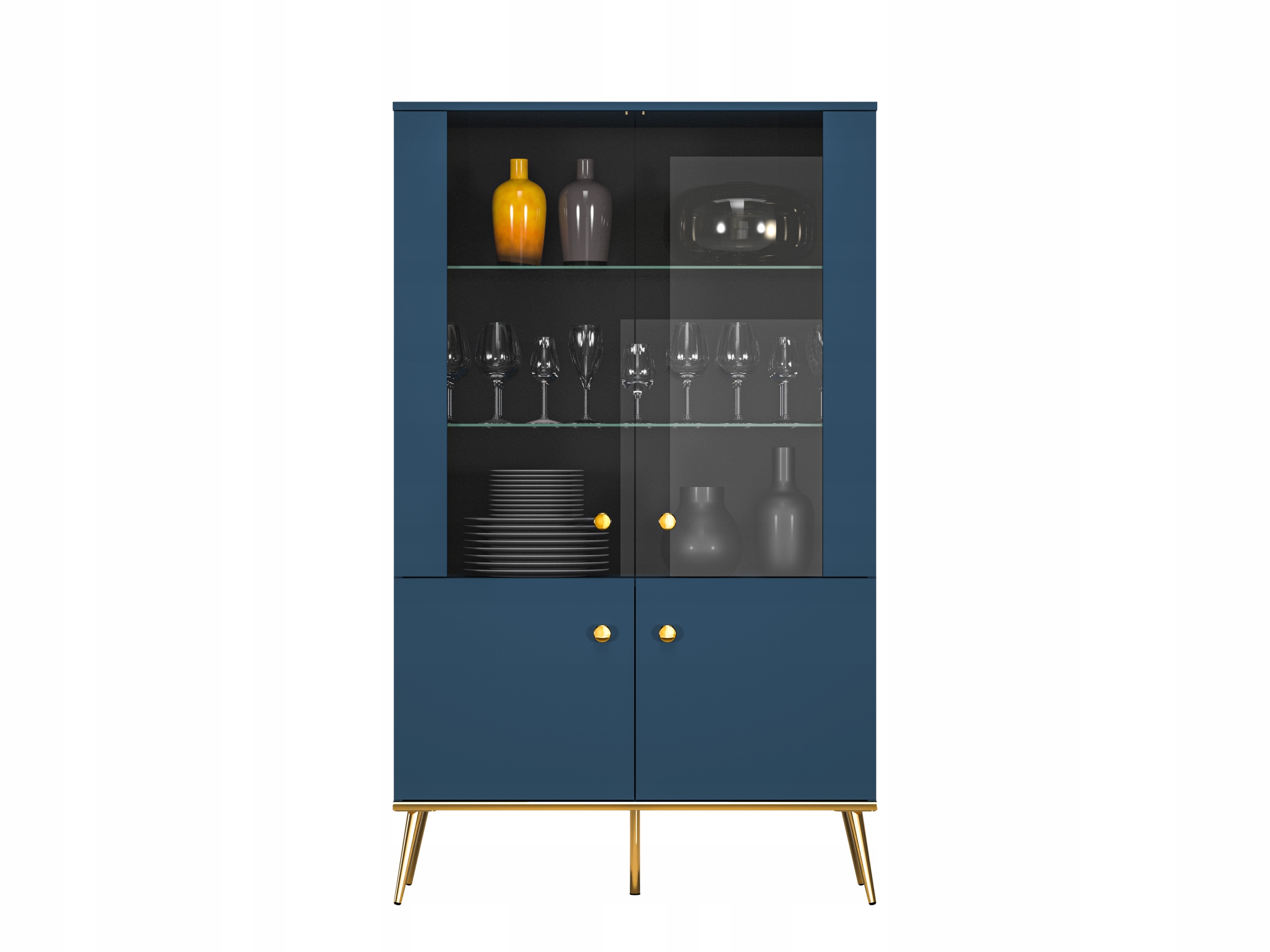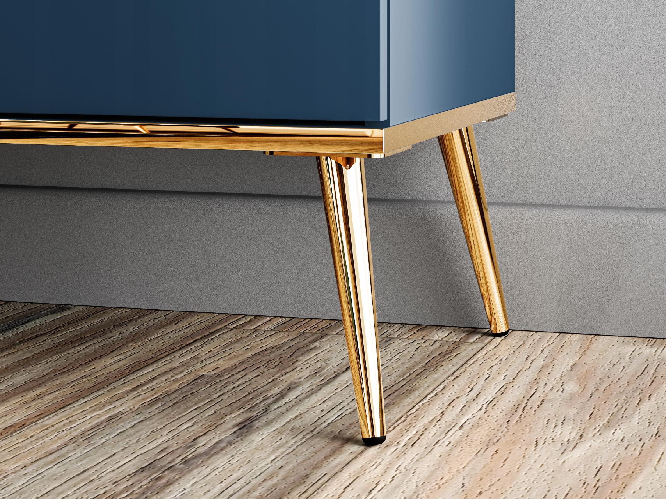 Skośne stożkowe nóżki w kolorze błyszczącego złota dodają witrynie niepowtarzalnego charakteru. To detale, które idealnie komponują się z głębokim błękitem oraz z wieńcem dolnym, również wykończonym w tym samym odcieniu złota, nadając meblowi wyjątkowego blasku i szyku. Złote uchwyty stanowią dopełnienie tej pełnej kunsztu oraz szyku kolekcji, podkreślając luksusowy charakter mebli.