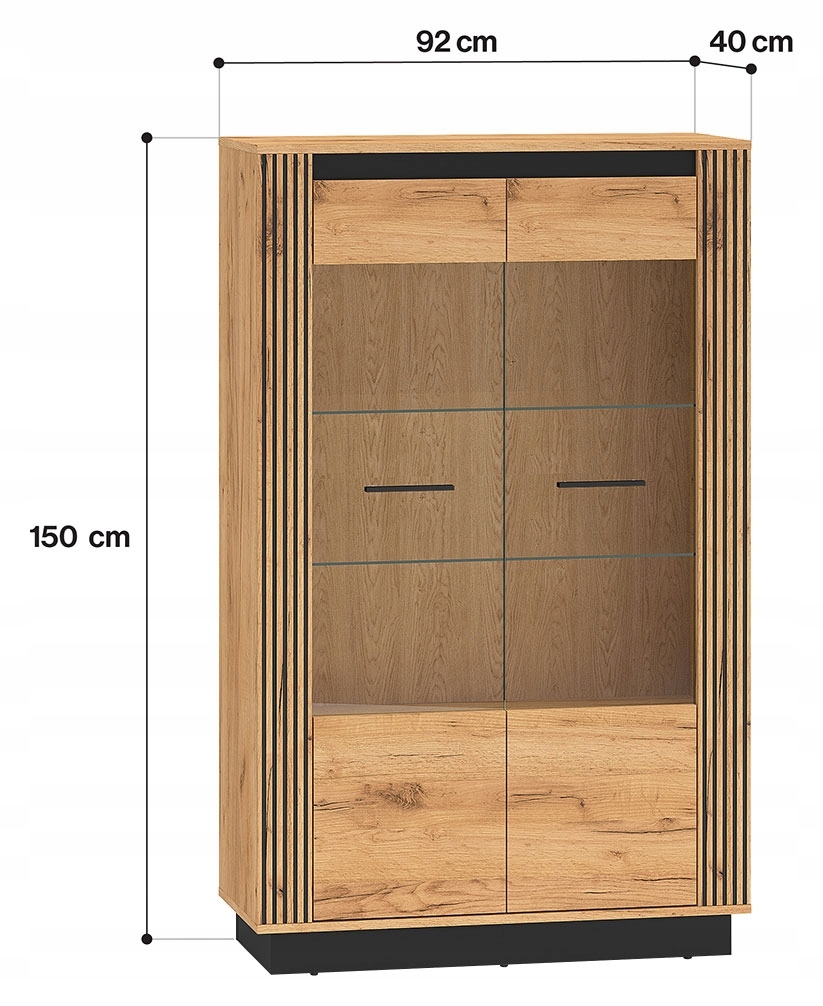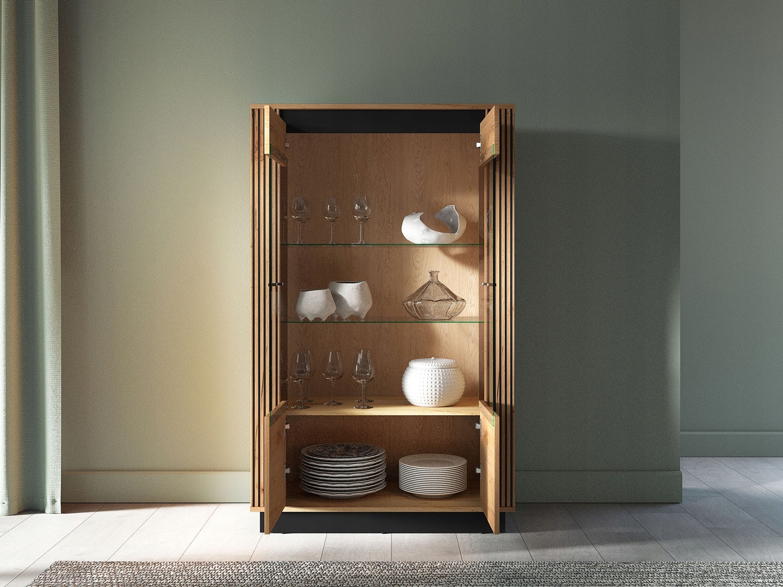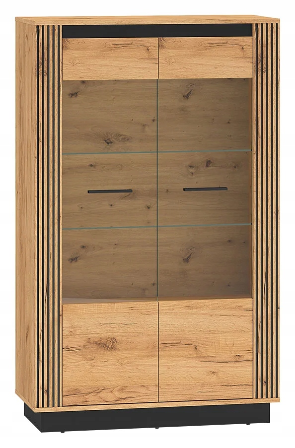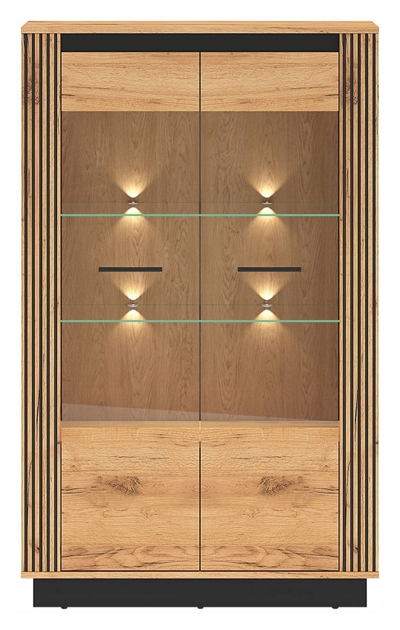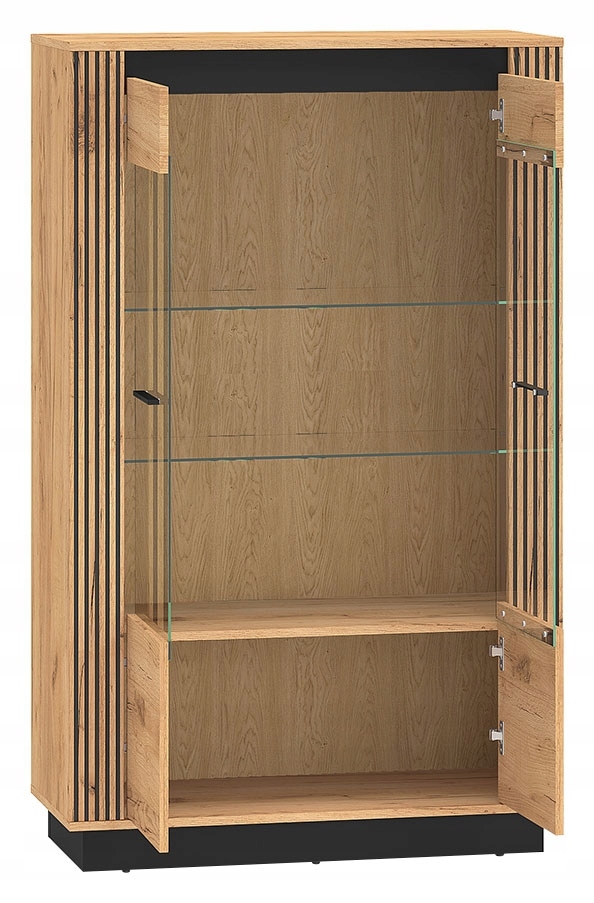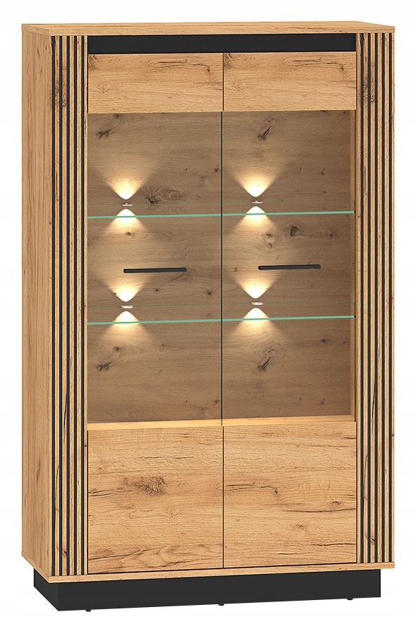 Prezentowana niska witryna do salonu swoją funkcjonalnością przypomina komodę, choć jednocześnie pełni wyjątkowo istotną rolę dekoracyjną. Jej blat, znajdujący się na wysokości wzroku, można wykorzystać jako miejsce do wyeksponowania dodatkowych ozdób typu kwiaty w donicach czy świece. Z kolei przeszklone wnęki z opcją oświetlenia najlepiej sprawdzą się do przechowywania pięknych kieliszków, bądź porcelany. Witryna zapewnia dużą przestrzeń na przedmioty niezbędne w każdym salonie lub jadalni. Jest też elementem dekoracyjnym dzięki wyrazistym czarnym akcentom i lamelom na swoich frontach.