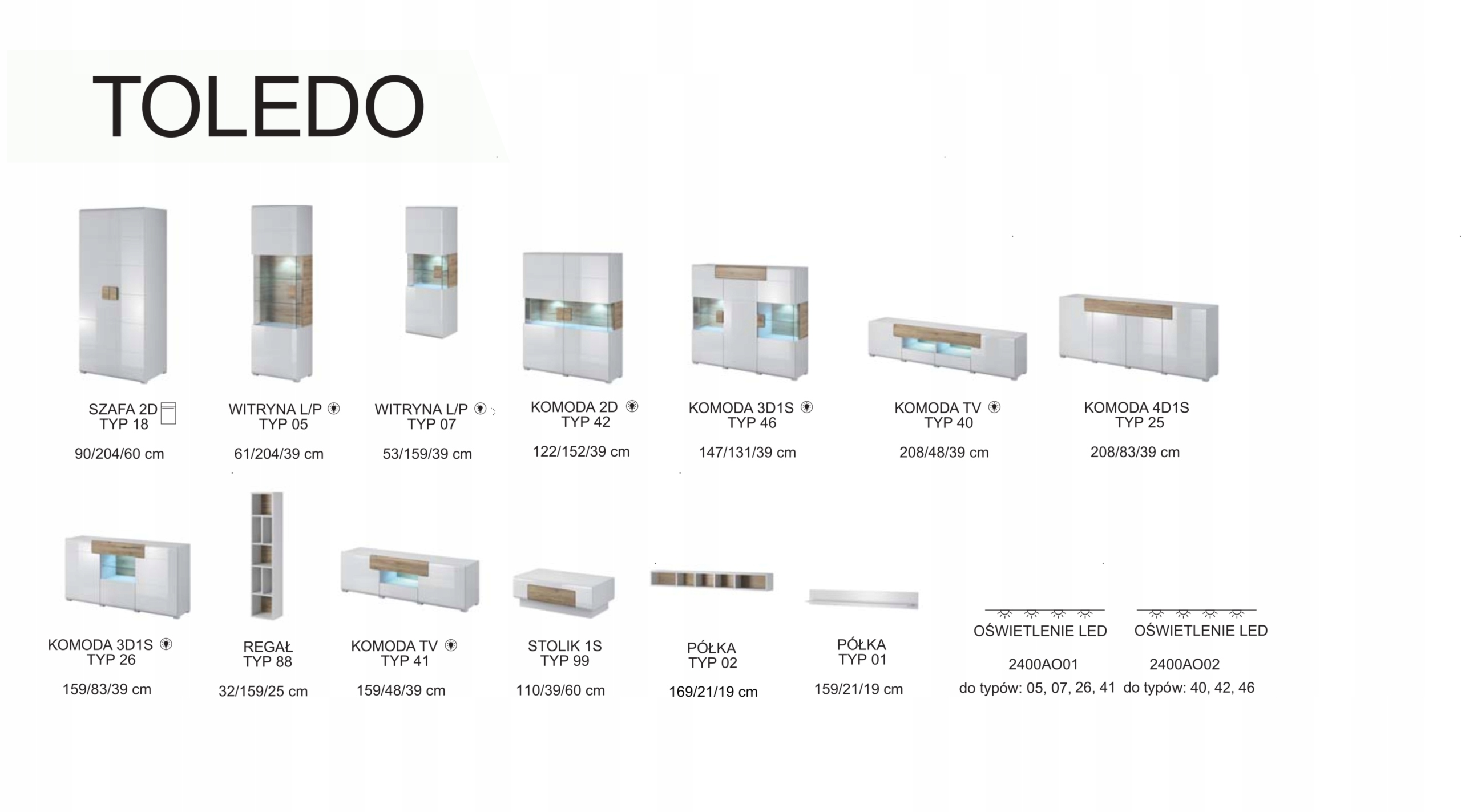 Komoda Toledo WM dostarczana jest do samodzielnego montażu. Wszystkie niezbędne elementy oraz instrukcja montażu znajdują się w zestawie, dzięki czemu samodzielne złożenie mebla jest proste i intuicyjne. Opcjonalnie, mebel może zostać wyposażony w atrakcyjne oświetlenie LED, które jeszcze bardziej podkreśli jego elegancki charakter.