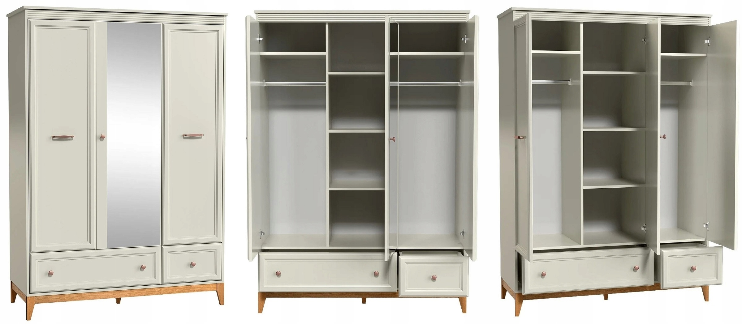 Centralna część szafy wyposażona jest w lustro, za którym kryją się trzy pojemne półki – idealne na ubrania złożone, dodatki czy pościel. Po bokach znajdują się przestrzenie z półką górną i drążkiem na ubrania wiszące, co zapewnia pełną organizację garderoby.