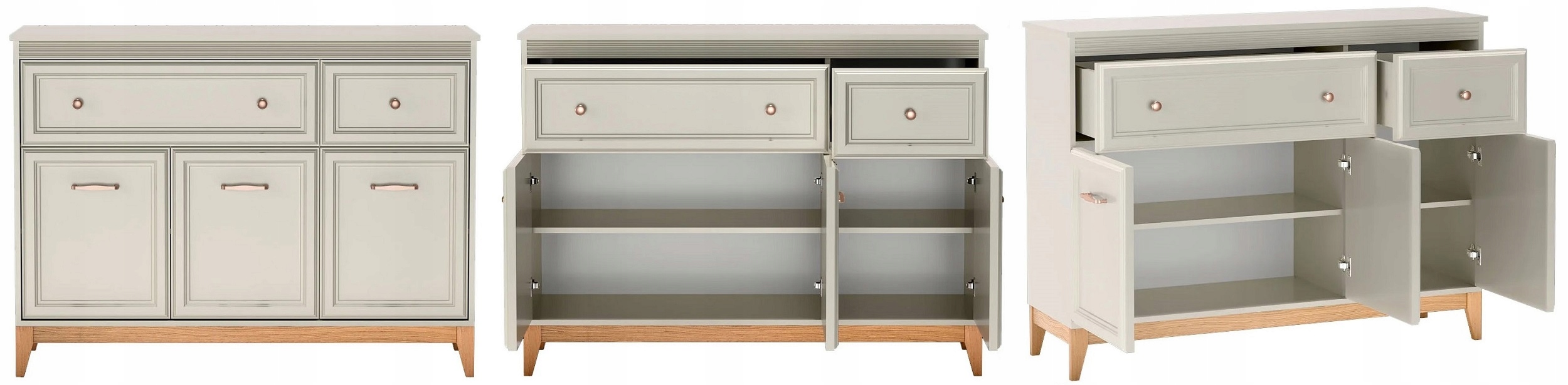 Komoda Windsor – klasyczna elegancja w odcieniu kaszmiru Szukasz mebla, który połączy ponadczasowy styl z funkcjonalnością? Komoda Windsor to kwintesencja elegancji i wyrafinowanego rzemiosła. Jej subtelny odcień kaszmiru nadaje wnętrzu lekkości i harmonii, a dekoracyjne listwy MDF na frontach podkreślają klasyczny charakter mebla.